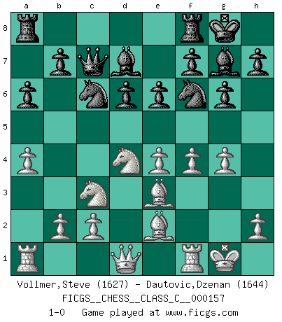 Last move : 1-0 2010 December 13 10:29:9 [Event "FICGS__CHESS__CLASS_C__000157"] [Site "FICGS"] [Date "2010.09.22"] [Round "1"] [White "Vollmer,Steve"] [Black "Dautovic,Dzenan"] [Result "1-0"] [WhiteElo "1627"] [BlackElo "1644"] 1.d4 d6 2.e4 Nf6 3.Nc3 g6 4.Nf3 Bg7 5.Be2 O-O 6.O-O c5 7.Be3 cxd4 8.Bxd4 Nc6 9.Be3 a6 10.a4 Qc7 11.Nd4 e6 12.f4 Bd7 13.g4 1-0 This chess game has been lost on time (started : 2010.09.22 20:14:57) Queen's Pawn Kingside Castling by player Black (move 5) Kingside Castling by player White (move 6) Player White won this chess game. Follow this game move after move (download)Bobby Fischer is the greatest Chess genius of all time ! (Alexander Kotov) Ein Großmeister muß tausende Partien in seinem Kopf speichern, denn diese sind für Ihn, was die Worte der Muttersprache für gewöhnliche Leute sind, oder Noten für Musiker... (Garry Kasparov) Aún el Rey más flojo huye despavorido ante la amenaza de un Jaque doble. (Aaron Nimzowitsch) Seul un grand joueur sait à quel point il joue faiblement. (Xavier Tartacover) He who defends everything defends nothing. (Frederick the Great)