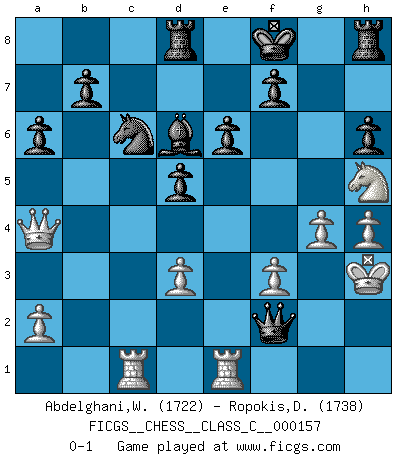 Last move : 0-1 2010 September 25 18:51:48 [Event "FICGS__CHESS__CLASS_C__000157"] [Site "FICGS"] [Date "2010.09.22"] [Round "1"] [White "Abdelghani,Wael"] [Black "Ropokis,Dimitrios"] [Result "0-1"] [WhiteElo "1722"] [BlackElo "1738"] 1.e4 c6 2.d4 d5 3.e5 Bf5 4.h4 h6 5.g4 Be4 6.f3 Bh7 7.Ne2 e6 8.Be3 Ne7 9.Nf4 c5 10.Nc3 Nbc6 11.Rc1 cxd4 12.Bxd4 Nxd4 13.Qxd4 a6 14.Nh5 Nc6 15.Qf4 Qa5 16.Kf2 Qb6+ 17.Kg2 Qxb2 18.Na4 Qxe5 19.Nb6 Rd8 20.Qa4 Qc3 21.Bd3 Bxd3 22.cxd3 Qb2+ 23.Kh3 Qxb6 24.Rhe1 Bd6 25.Nxg7+ Kf8 26.Nh5 Qf2 0-1 Caro-Kann : Advance variation Player Black won this chess game. Follow this game move after move (download)Nonsense was the last thing Fischer was interested in, as far as Chess was concerned. (Elie Agur) Schach ist Leben. (Robert James Fischer) Debemos de asegurarnos de que el Ajedrez no se convierta en un lenguaje muerto, muy interesante, pero tan solo para un grupo muy pequeño. (Sytze Faber) Je fais ceci parce que dans cinquante coups j'obtiendrai cela; je m'appelle Mikhail Moisevitch Botvinnik. (Botvinnik) In fact if nothing is done against this teddy bear, hereby I announce that I would quit chess, rapid chess, blitz chess, postal chess, email chess, server chess and correspondence chess I will then switch to a table game where teddy bears aren't going to be seen for a while, like Poker, or Roulette, all 18+ games. (Elmer Valderrama)