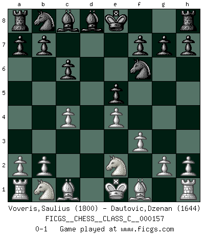 Last move : 0-1 2010 November 6 9:54:35 [Event "FICGS__CHESS__CLASS_C__000157"] [Site "FICGS"] [Date "2010.09.22"] [Round "1"] [White "Voveris,Saulius"] [Black "Dautovic,Dzenan"] [Result "0-1"] [WhiteElo "1800"] [BlackElo "1644"] 1.d4 d6 2.e4 Nf6 3.f3 e5 4.Ne2 Be7 5.c4 c6 6.dxe5 dxe5 7.Qxd8+ Bxd8 0-1 This chess game has been lost on time (started : 2010.09.22 20:14:57) Queen's Pawn Player Black won this chess game. Follow this game move after move (download)Chess is like war on a board. (Bobby Fischer) Ich kämpfe solange mein Gegner einen Fehler machen kann. (Emanuel Lasker) Puntos débiles o agujeros en la posición de tu oponente deben de ser ocupados por piezas, no Peones. (Siegbert Tarrasch) Horreur, mais aussi harmonie suprême : qu'y avait-il en effet au monde en dehors des échecs ? Le brouillard, l'inconnu, le non-être... (Vladimir Nabokov) It's not enough to succeed. Others must fail. (Gore Vidal)