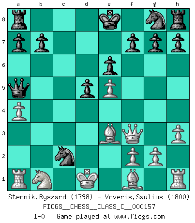Last move : 1-0 2010 November 27 22:49:12 [Event "FICGS__CHESS__CLASS_C__000157"] [Site "FICGS"] [Date "2010.09.22"] [Round "1"] [White "Sternik,Ryszard"] [Black "Voveris,Saulius"] [Result "1-0"] [WhiteElo "1798"] [BlackElo "1800"] 1.e4 c6 2.d4 d5 3.e5 c5 4.dxc5 Nc6 5.Nf3 Bg4 6.h3 Bxf3 7.Qxf3 e6 8.Be3 Qa5+ 9.c3 Bxc5 10.b4 Bxb4 11.cxb4 Nxb4 12.a4 Nc2+ 13.Kd1 1-0 Caro-Kann : Advance variation Player White won this chess game. Follow this game move after move (download)I am still a victim of Chess. It has all the beauty of art and much more. It cannot be commercialized. Chess is much purer than art in its social position. (Marcel Duchamp) Wenn ich mich einlogge, glauben die Leute gewöhnlich nicht, dass ich es selbst bin und sie fangen an, mir dumme Fragen zu stellen. Und wenn sie es glauben, stellen sie wieder andere dumme Fragen. (Judith Polgar) En el tablero, la mentira e hipocresía no sobreviven mucho. (Emanuel Lasker) Fischer est le meilleur joueur du monde et Karpov n'est qu'un joueur de bistrot. (Garry Kasparov, agé de 16 ans) This is where the fun begins. (Anakin Skywalker in Star Wars ep.3)