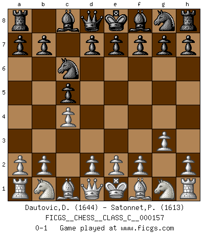 Last move : 0-1 2010 December 4 10:26:29 [Event "FICGS__CHESS__CLASS_C__000157"] [Site "FICGS"] [Date "2010.09.22"] [Round "1"] [White "Dautovic,Dzenan"] [Black "Satonnet,Patrick"] [Result "0-1"] [WhiteElo "1644"] [BlackElo "1613"] 1.c4 c5 2.g3 Nc6 0-1 This chess game has been lost on time (started : 2010.09.22 20:14:57) English : Symmetrical variation Player Black won this chess game. Follow this game move after move (download)Good offense and good defense both begin with good development. (Bruce A. Moon) Herr Iljumschinow ist ein etwas merkwürdiger Geschäftsmann: Er arbeitet zusammen mit Leuten wie Muammar al-Gaddafi; früher ist das Saddam Hussein gewesen. (Joel Lautier) Todos los Maestros de Ajedrez fueron un día unos principiantes. (Chernev) Roi des jeux et jeu des rois, les échecs portent en eux un sentiment d'infini. Ils donnent à celui qui s'est efforcé d'en approfondir les arcanes l'impression de n'être pas à la mesure de l'homme; en fait, ils constituent un résumé de l'univers, un microcosme, et figurent cette grande échelle qui, dans les plans de la lumière descend jusqu'à la matière, qui des abîmes insondables remonte jusqu'en l'infini de Dieu. (Pyrame) It's not a bug - it's an undocumented feature. (Anonymous)