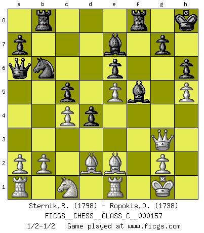 Last move : 1/2-1/2 2010 October 5 12:5:51 [Event "FICGS__CHESS__CLASS_C__000157"] [Site "FICGS"] [Date "2010.09.22"] [Round "1"] [White "Sternik,Ryszard"] [Black "Ropokis,Dimitrios"] [Result "1/2-1/2"] [WhiteElo "1798"] [BlackElo "1738"] 1.e4 c6 2.d4 d5 3.e5 Bf5 4.Nf3 e6 5.Nbd2 h6 6.Be2 Ne7 7.O-O Nd7 8.Re1 Qc7 9.Nf1 c5 10.dxc5 Nxc5 11.Be3 Nc6 12.Nd4 Bg6 13.Nxc6 bxc6 14.Rc1 Be7 15.Bh5 Bh7 16.Nd2 O-O 17.Qg4 Kh8 18.Qg3 Nd7 19.f4 Rab8 20.Nb3 c5 21.c4 d4 22.Bd2 Qc8 23.Ra1 Qa6 24.Be2 f6 25.h4 Bf5 26.h5 fxe5 27.fxe5 Nb6 28.Nc1 1/2-1/2 Caro-Kann : Advance variation Kingside Castling by player White (move 7) Kingside Castling by player Black (move 16) This chess game ended in a draw. Follow this game move after move (download)You know, comrade Pachman, I don't enjoy being a Minister, I would rather play Chess like you. (Che Guevara) Es tut gut, die Entwicklungsperiode von, [...] demokratischem Geist durchdringen zu lassen. Wie undemokratisch wäre es doch beispielsweise, den einen Offizier große Spaziertouren vornehmen zu lassen, während die anderen zu Hause säßen und sich entsetzlich langweilten. (Aaron Nimzowitsch) Aún el Rey más flojo huye despavorido ante la amenaza de un Jaque doble. (Aaron Nimzowitsch) Que feriez-vous si vous étiez en train de jouer aux échecs et que la fin du monde arrive ? Je continuerais à jouer. (Saint Borromée) Always remember that you are unique; just like everyone else. (Unknown)