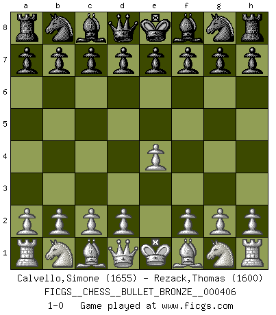 Last move : 1-0 2010 September 23 21:3:33 [Event "FICGS__CHESS__BULLET_BRONZE__000406"] [Site "FICGS"] [Date "2010.09.23"] [Round "1"] [White "Calvello,Simone"] [Black "Rezack,Thomas"] [Result "1-0"] [WhiteElo "1655"] [BlackElo "1600"] 1.e4 1-0 This chess game has been lost on time (started : 2010.09.23 18:48:1) King's pawn Opening Player White won this chess game. Follow this game move after move (download)Chess demands total concentration. (Bobby Fischer) Offener Brief an US-Präsident Bush anlässlich der Verhaftung Bobby Fishers: Verhaften Sie mich. Stecken Sie mich in dieselbe Zelle wie Bobby Fisher und geben Sie uns ein Schachspiel mit. (Boris Vassilievich Spassky) Aún deseo matar a Fischer. (Boris Spassky) Toutes les manuvres exécutées sur une colonne ouverte ont pour but ultime l'intrusion définitive sur la septième ou la huitième rangée, en plein cur de la position ennemie. (Aaron Nimzovitch) Life is pleasant. Death is peaceful. It's the transition that's troublesome. (Isaac Asimov)
