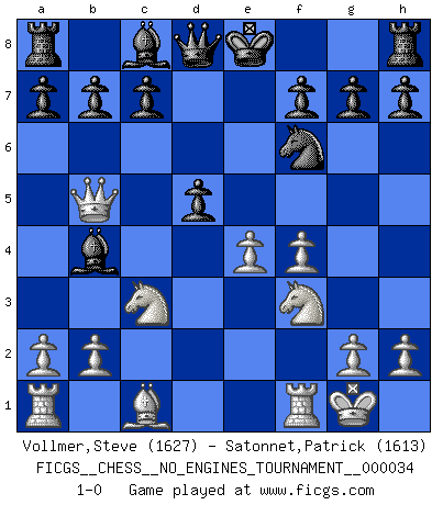 Last move : 1-0 2010 October 28 3:33:4 [Event "FICGS__CHESS__NO_ENGINES_TOURNAMENT__000034"] [Site "FICGS"] [Date "2010.09.24"] [Round "1"] [White "Vollmer,Steve"] [Black "Satonnet,Patrick"] [Result "1-0"] [WhiteElo "1627"] [BlackElo "1613"] 1.d4 d5 2.c4 dxc4 3.e4 Nc6 4.d5 Ne5 5.f4 Nd3+ 6.Bxd3 cxd3 7.Qxd3 e6 8.Nf3 exd5 9.Nc3 Bb4 10.O-O Nf6 11.Qb5+ 1-0 QGA : 3.e4 Kingside Castling by player White (move 10) Player White won this chess game. Follow this game move after move (download)You have to have the fighting spirit. You have to force moves and take chances. (Bobby Fischer) Intelligenz läßt sich nicht am Weg, sondern nur am Ergebnis feststellen. (Garry Kasparov) Preferería tener un Peón que un dedo. (Reuben Fine) Botvinnik disait en comparant les échecs à la musique: Il existe une science dont le but est l'étude de l'acoustique et des sons. Mais il y a aussi un art qui se sert de l'océan des sons : c'est la musique. De toute évidence, il en est de même pour la pensée. La logique est l'étude des lois de la réflexion et les échecs reflètent, en tant qu'art, le côté logique de la réflexion, sous la forme d'images artistiques... Extrait de Fischer - Spassky, Reykjavik 1972 par Alexander & F. Wyndham (Ed. Solar), p 37. Macintosh - we might not get everything right, but at least we knew the century was going to end. (Douglas Adams)