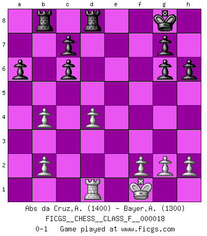 Last move : 0-1 2006 December 5 21:17:1 [Event "FICGS__CHESS__CLASS_F__000018"] [Site "FICGS"] [Date "2006.11.22"] [Round "1"] [White "Abs da Cruz,Andre"] [Black "Bayer,Alexander"] [Result "0-1"] [WhiteElo "1400"] [BlackElo "1300"] 1.d4 Nf6 2.c4 e6 3.Nc3 Bb4 4.Qc2 d5 5.cxd5 exd5 6.Bg5 O-O 7.Nf3 h6 8.Bxf6 Qxf6 9.e3 Nc6 10.Bb5 a6 11.Bxc6 bxc6 12.O-O Bf5 13.e4 dxe4 14.Nxe4 Qg6 15.a3 Bxe4 16.Qe2 Bd3 17.Ne5 Bxe2 18.Nxg6 fxg6 19.axb4 Bxf1 20.Kxf1 Rfd8 21.Rd1 Rab8 0-1 Nimzo-Indian : Classical, Noa variation, 5.cd ed Kingside Castling by player Black (move 6) Kingside Castling by player White (move 12) Player Black won this chess game. Follow this game move after move (download)What is the object of playing a gambit opening?... To acquire a reputation of being a dashing player at the cost of losing a game. (Siegbert Tarrasch) Irgendwie scheint mir sonntags früh um 9 Uhr der Killerinstinkt verloren gegangen zu sein. (Alexej Shirov) Un jugador que es sorprendido, esta derrotado a medias. (Proverbio) Les pièces de l'échiquier étaient impitoyables. Elles le retenaient, elles l'absorbaient. Il y avait de l'horreur en cela, mais aussi une harmonie unique. Car, qu'y a-t-il dans le monde, à part les échecs ? (V. Nabokov) Opportunities multiply as they are seized. (Sun Tzu)