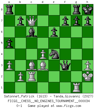 Last move : 0-1 2011 May 1 17:34:17 [Event "FICGS__CHESS__NO_ENGINES_TOURNAMENT__000034"] [Site "FICGS"] [Date "2010.09.24"] [Round "1"] [White "Satonnet,Patrick"] [Black "Tanda,Giovanni"] [Result "0-1"] [WhiteElo "1613"] [BlackElo "2027"] 1.e4 d5 2.exd5 Qxd5 3.Nc3 Qa5 4.Bc4 Nf6 5.Nf3 c6 6.O-O Bf5 7.d4 e6 8.Bd2 Bb4 9.a3 Bxc3 10.Bxc3 Qc7 11.Qe2 Nbd7 12.h3 O-O 13.Nh4 Be4 14.Rae1 a5 15.f3 Bd5 16.Bd3 Nh5 17.g4 Qg3+ 18.Qg2 Qxh4 19.gxh5 Qxh5 20.Kh2 Kh8 21.Rg1 Rg8 22.Bd2 Bxf3 23.Qg3 c5 24.c3 cxd4 25.cxd4 Bd5 26.Rc1 Bc6 27.Bc3 Nf6 28.Rc2 Ne4 29.Qc7 Qf3 0-1 Scandinavian (centre counter) defense Kingside Castling by player White (move 6) Kingside Castling by player Black (move 12) Player Black won this chess game. Follow this game move after move (download)Chess, like love, is infectious at any age. (Flohr) Sie bekommen vielleicht den Eindruck, dass die Spitzenspieler überhaupt gar nicht so stark sind. Aber das stimmt nicht. Es ist eine Illusion. Mit einem Computer an der Seite ist es sehr leicht, Urteile zu fällen, aber wenn man alleine am Brett sitzt, sieht die Sache ganz anders aus. (Vladimir Kramnik) El Ajedrez es realmente noventa y nueve por ciento calculación. (Soltis) Les échecs sont plus proches de l'art de l'assassinat que de l'art de la guerre. (Arturo Perez-Reverte) Whoever said the pen is mightier than the sword obviously never encountered automatic weapons. (US General Douglas MacArthur)