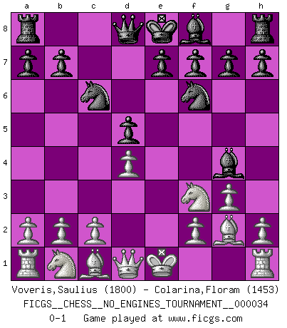 Last move : 0-1 2010 November 9 9:53:32 [Event "FICGS__CHESS__NO_ENGINES_TOURNAMENT__000034"] [Site "FICGS"] [Date "2010.09.24"] [Round "1"] [White "Voveris,Saulius"] [Black "Colarina,Floram"] [Result "0-1"] [WhiteElo "1800"] [BlackElo "1453"] 1.d4 c6 2.e4 d5 3.exd5 cxd5 4.Nf3 Nc6 5.g3 Bg4 6.Bg2 Nf6 0-1 This chess game has been lost on time (started : 2010.09.24 6:9:26) Queen's pawn Player Black won this chess game. Follow this game move after move (download)The sign of a great Master is his ability to win a won game quickly and painlessly. (Irving Chernev) Der 70jährige Viktor Kortschnoi: Die Rentenanstalt wollte mich zwingen in Rente zu gehen. Meine Frau erhält jetzt eine Pension- und ich zahle weiter in die Rentenkasse ein! (Viktor Kortschnoi) Tu sabes, camarada Pachman, no disfruto el ser un Ministro, preferería jugar al Ajedrez como tu. (Che Guevara) Je crois qu'il existe des manières très spécifiques de jouer efficacement contre une machine. Evidemment, nous n'avons aucune chance en technique pure, parce que l'ordinateur calcule de manière parfaite. Mais lorsque nous faisons appel à notre cerveau, en utilisant l'intuition et la compréhension, alors nous restons beaucoup plus forts. (Anatoli Karpov) Pushing plastic is for the many, pushing virtual pieces is for the fewer, pushing wood is for the very few. (Normajean Yates)