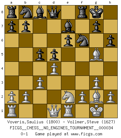 Last move : 0-1 2010 November 27 22:49:12 [Event "FICGS__CHESS__NO_ENGINES_TOURNAMENT__000034"] [Site "FICGS"] [Date "2010.09.24"] [Round "1"] [White "Voveris,Saulius"] [Black "Vollmer,Steve"] [Result "0-1"] [WhiteElo "1800"] [BlackElo "1627"] 1.d4 f5 2.Nc3 e6 3.e4 fxe4 4.Nxe4 Nf6 5.g3 Nxe4 6.Bg2 Nf6 7.Ne2 d5 8.O-O Be7 9.c3 O-O 10.Re1 c5 11.Bg5 h6 0-1 Dutch Kingside Castling by player White (move 8) Kingside Castling by player Black (move 9) Player Black won this chess game. Follow this game move after move (download)White lost because he failed to remember the right continuation and had to think up the moves himself. (Siegbert Tarrasch) Frage des Reporters: -Welche besonderen Umstände rechtfertigen das Anhalten der Uhren während einer Turnierpartie? Antwort: -Einen Fotographen zu strangulieren. (Siegbert Tarrasch) Cuando tengo las piezas blancas, yo gano porque soy blanco; Cuando tengo las piezas negras, yo gano porque soy Bogolyubov. (Bogolyubov) Aux échecs, l'amour-propre est satisfait quand on remporte la victoire, mais il n'y a pas de honte à être battu. (Benjamin Franklin) Tomorrow's what you make of it. (Horatio Caine, C.S.I. Miami)