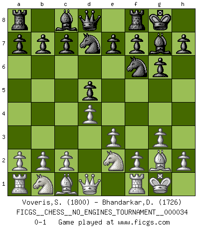 Last move : 0-1 2010 November 5 21:55:32 [Event "FICGS__CHESS__NO_ENGINES_TOURNAMENT__000034"] [Site "FICGS"] [Date "2010.09.24"] [Round "1"] [White "Voveris,Saulius"] [Black "Bhandarkar,Dinesh"] [Result "0-1"] [WhiteElo "1800"] [BlackElo "1726"] 1.d4 Nf6 2.g3 g6 3.Bg2 Bg7 4.e3 O-O 5.Ne2 d5 6.O-O Nbd7 0-1 This chess game has been lost on time (started : 2010.09.24 6:9:26) Queen's pawn game Kingside Castling by player Black (move 4) Kingside Castling by player White (move 6) Player Black won this chess game. Follow this game move after move (download)You are for me the Queen on d8 and I am the Pawn on d7 !! (Eduard Gufeld) Ein Großmeister muß tausende Partien in seinem Kopf speichern, denn diese sind für Ihn, was die Worte der Muttersprache für gewöhnliche Leute sind, oder Noten für Musiker... (Garry Kasparov) Las combinaciones han sido siempre el aspecto más intrigante del Ajedrez. Los Maestros las buscan, el público las aplauden, los críticos las alaban. La razón se debe a que las combinaciones hacen posible que el Ajedrez sea más que un ejercicio matemático con una carencia de vida. Ellas son la poesía del juego, son del Ajedrez lo que la melodía es de la música. Ellas representan el triunfo de la mente sobre la materia. (Reuben Fine) Fischer est le meilleur joueur du monde et Karpov n'est qu'un joueur de bistrot. (Garry Kasparov, agé de 16 ans) The Internet is the world's largest library. It's just that all the books are on the floor. (John Allen Paulos)