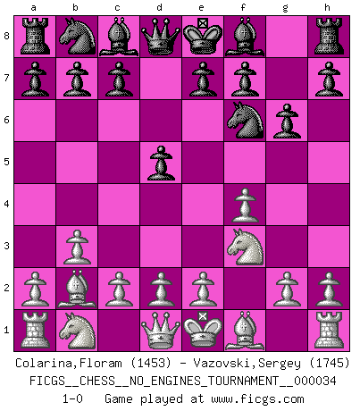 Last move : 1-0 2010 November 9 21:52:44 [Event "FICGS__CHESS__NO_ENGINES_TOURNAMENT__000034"] [Site "FICGS"] [Date "2010.09.24"] [Round "1"] [White "Colarina,Floram"] [Black "Vazovski,Sergey"] [Result "1-0"] [WhiteElo "1453"] [BlackElo "1745"] 1.f4 d5 2.Nf3 Nf6 3.b3 g6 4.Bb2 1-0 This chess game has been lost on time (started : 2010.09.24 6:9:26) Bird's Opening Player White won this chess game. Follow this game move after move (download)Chess mastery essentially consists of analyzing Chess positions accurately. (Mikhail Botvinnik) Man kann eine Schachpartie nur gewinnen, wenn das Gleichgewicht gestört ist. In einer Stellung mit ungestörtem Gleichgewicht ist auch das größte Genie hilflos - in der Stellung steckt dann eben kein genialer Einfall. (Wilhelm Steinitz) El Ajedrez hace al hombre ser mas sabio y ver mas claro. (Vladimir Putin) Tous ces prétendus hommes politiques sont les pions, les Cavaliers, les Tours ou les Fous d'une partie d'échecs qui se jouera tant qu'un hasard ne renversera pas l'échiquier. (Honoré de Balzac) Men never do evil so completely and cheerfully as when they do it from religious conviction. (Blaise Pascal)