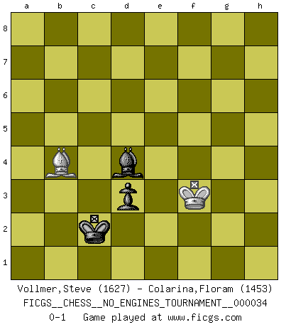 Last move : 0-1 2010 December 28 0:56:14 [Event "FICGS__CHESS__NO_ENGINES_TOURNAMENT__000034"] [Site "FICGS"] [Date "2010.09.24"] [Round "1"] [White "Vollmer,Steve"] [Black "Colarina,Floram"] [Result "0-1"] [WhiteElo "1627"] [BlackElo "1453"] 1.e4 d5 2.exd5 Qxd5 3.Nc3 Qd6 4.d4 g6 5.Nf3 Bg7 6.Bd3 Bg4 7.Be3 Nf6 8.O-O O-O 9.Qe2 a6 10.h3 Bd7 11.Rfe1 Nc6 12.Ne4 Nxe4 13.Bxe4 e5 14.Rad1 exd4 15.Nxd4 Nxd4 16.Qf1 Qb6 17.c3 c5 18.cxd4 cxd4 19.Bc1 Rfd8 20.Bd3 Bc6 21.Qe2 Qa5 22.b3 Re8 23.Qd2 Rxe1+ 24.Rxe1 Qd5 25.f3 a5 26.Re7 b5 27.Qf4 Re8 28.Rxe8+ Bxe8 29.Qb8 Qe5 30.Qxe5 Bxe5 31.f4 Bd6 32.Bd2 f5 33.Bxa5 Bxf4 34.Kf2 Kf7 35.Bc2 Bc6 36.a4 bxa4 37.bxa4 Ke7 38.Bb4+ Kd7 39.g4 fxg4 40.hxg4 h5 41.gxh5 gxh5 42.Bd1 h4 43.a5 Kc7 44.Bf3 h3 45.Bxc6 Kxc6 46.a6 Bb8 47.Ba5 Kb5 48.Bc7 Ba7 49.Kg3 d3 50.Bf4 Kxa6 51.Kxh3 Kb5 52.Bd2 Kc4 53.Kg2 Kb3 54.Kf3 Kc2 55.Bb4 Bd4 0-1 Scandinavian : Pytel-Wade variation Kingside Castling by player White (move 8) Kingside Castling by player Black (move 8) 10 pieces endgame at move 41 : White KBBPP , Black KBBPP WHITE : King + 2 Bishops 2 Pawns BLACK : King + 2 Bishops 2 Pawns 9 pieces endgame at move 41 : White KBBP , Black KBBPP WHITE : King + 2 Bishops 1 Pawn BLACK : King + 2 Bishops 2 Pawns 8 pieces endgame at move 45 : White KBBP , Black KBPP WHITE : King + 2 Bishops 1 Pawn BLACK : King + 1 Bishop 2 Pawns 7 pieces endgame at move 45 : White KBP , Black KBPP WHITE : King + 1 Bishop 1 Pawn BLACK : King + 1 Bishop 2 Pawns 6 pieces endgame at move 50 : White KB , Black KBPP WHITE : King + 1 Bishop BLACK : King + 1 Bishop 2 Pawns 5 pieces endgame at move 51 : White KB , Black KBP WHITE : King + 1 Bishop BLACK : King + 1 Bishop 1 Pawn Player Black won this chess game. Follow this game move after move (download)Bobby is the most misunderstood, misquoted celebrity walking the face of this earth. (Yasser Seirawan) Sicherlich können nur Meister einen Stil haben. Daß ein nicht-Meister auch nur ein einziges Mal in seinem Leben eine Partie folgerecht durchführte, habe ich niemals bemerkt. (Emanuel Lasker) Muchos jugadores de Ajedrez se sorprendían cuando después de la partida, Fischer explicaba con calma: 'Yo ya había analizado esta posibilidad' en una posición en la cual yo creía que no era posible de prever desde la apertura. (Mikhail Tal) Aidez vos pièces, elles vous aideront. (Paul Morphy) I've never seen so many men wasted so badly. (Blondie in The Good, The Bad and The Ugly)