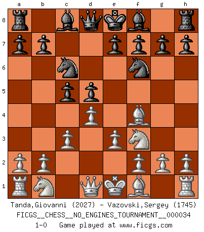 Last move : 1-0 2010 November 10 9:55:51 [Event "FICGS__CHESS__NO_ENGINES_TOURNAMENT__000034"] [Site "FICGS"] [Date "2010.09.24"] [Round "1"] [White "Tanda,Giovanni"] [Black "Vazovski,Sergey"] [Result "1-0"] [WhiteElo "2027"] [BlackElo "1745"] 1.d4 d5 2.Bf4 Nf6 3.e3 c5 4.Nf3 Nc6 5.c3 1-0 This chess game has been lost on time (started : 2010.09.24 6:9:26) Queen's pawn, Mason variation Player White won this chess game. Follow this game move after move (download)It was clear to me that the vulnerable point of the American Grandmaster (Bobby Fischer) was in double-edged, hanging, irrational positions, where he often failed to find a win even in a won position. (Efim Geller) Fischer ist das größte Genie, das je vom Schachhimmel heruntergestiegen ist. (Mikhail Nekhemyevich Tal) El Ajedrez es una manera fabulosa para que los niños aprendan a autovalorarse y a autoestimarse. (Saudin Robovic) Aux échecs, les retours au sommet sont rares : les dommages psychologiques consécutifs à une défaite sont trop sévères. (Daily Telegraph) Memory... is the diary that we all carry with us. (Oscar Wilde, The Importance of Being Earnest)