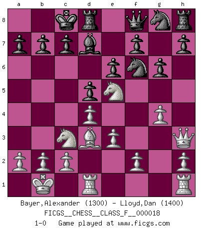 Last move : 1-0 2007 February 3 20:42:13 [Event "FICGS__CHESS__CLASS_F__000018"] [Site "FICGS"] [Date "2006.11.22"] [Round "1"] [White "Bayer,Alexander"] [Black "Lloyd,Dan"] [Result "1-0"] [WhiteElo "1300"] [BlackElo "1400"] 1.d4 d5 2.Bf4 e6 3.e3 Bd6 4.Bxd6 Qxd6 5.Qg4 g6 6.Nc3 Nd7 7.Nf3 Ndf6 8.Qh4 Bd7 9.Ne5 Qe7 10.Bd3 Nh5 11.Qh3 O-O-O 12.g4 Nhf6 13.O-O-O Qf8 14.Kb1 1-0 Queen's pawn, Mason variation Queenside Castling by player Black (move 11) Queenside Castling by player White (move 13) Player White won this chess game. Follow this game move after move (download)If a ruler does not understand Chess, how can he rule over a kingdom ? (King Khusros II) Pläne sind die Träume des Verständigen. (Ernst Freiherr von Feuchtersleben) La batalla por la última verdad nunca sera ganada. Y es por eso que el Ajedrez es tan fascinante. (Hans Kmoch) Aux échecs, les retours au sommet sont rares : les dommages psychologiques consécutifs à une défaite sont trop sévères. (Daily Telegraph) Memory is a way of holding onto the things you love, the things you are, the things you never want to lose. (from the television show: The Wonder Years)