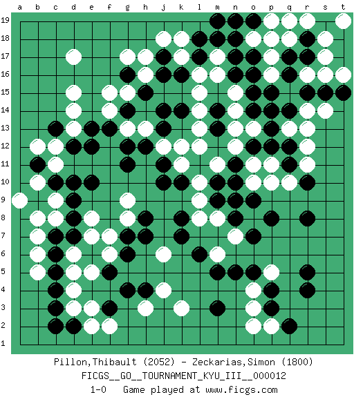 Last move : 1-0 2010 October 17 21:16:2 [Event "FICGS__GO__TOURNAMENT_KYU_III__000012"] [Site "FICGS"] [Date "2010.09.24"] [Round "1"] [Black "Pillon,Thibault"] [White "Zeckarias,Simon"] [Result "1-0"] [Rating 1 "2052"] [Rating 2 "1800"] 1.q16 d17 2.r4 d4 3.f3 h3 4.h4 j4 5.g4 k3 6.c3 d3 7.c4 d5 8.d2 e2 9.c2 e3 10.c6 f2 11.g16 d15 12.k16 c12 13.p3 r14 14.o17 s16 15.r17 r11 16.r8 p5 17.r5 o3 18.p4 o4 19.o5 p2 20.q2 o2 21.n5 m17 22.n16 k17 23.j17 j18 24.l17 k18 25.l18 h17 26.j16 h16 27.q12 r12 28.q14 q13 29.p13 r13 30.g7 c8 31.c10 e8 32.e10 g8 33.h8 g9 34.h7 f7 35.d12 d13 36.e12 c11 37.d10 b5 38.c5 b6 39.c7 b7 40.d8 c9 41.d9 b10 42.e6 f6 43.f5 e5 44.g6 d6 45.d7 e7 46.l6 j6 47.k8 p10 48.p8 l16 49.m18 l15 50.k14 l14 51.j14 l12 52.h15 g17 53.j11 k11 54.j10 o11 55.m13 l13 56.n11 j12 57.g11 g13 58.e13 f15 59.b9 b8 60.b11 a9 61.c13 d14 62.h12 h13 63.j13 k12 64.g14 f14 65.f13 b12 66.o12 n12 67.n10 n13 68.o14 n14 69.o15 m11 70.m10 l10 71.k10 l9 72.n8 n9 73.m9 m8 74.o9 o10 75.n9 l8 76.k7 m6 77.m5 n7 78.o7 g15 79.g12 m16 80.n17 s17 81.m3 q18 82.r18 p17 83.r15 p16 84.p15 o18 85.n18 n15 86.m14 s18 87.s15 o13 88.p12 r19 89.q17 t16 90.o19 p18 91.s19 t19 92.q19 n19 93.m19 p19 94.n19 q19 95.t15 s14 96.q11 q10 97.r10 p11 98.p14 r16 99.o16 1-0 Here are the names of the openings (joseki) played in the four corners : Corner d4 : d4 f3 Hoshi (Hwajeom, Seongjeom, Xingwei`) 4-4 Point. The star or hoshi (4-4) point, emphasizing influence at the potential expense of territory. Ikken Kakari (Hankan Keolch'im, Yi Gua`jiao~, 1-Space Low Approach). Black 2 is the standard approach move to the 4-4. Corner d16 : d17 g16 Komoku (Somok, Xiao~mu`) 3-4 Point. The komoku (3-4) point is the traditional corner enclosure move.. Corner q16 : q16 r14 Hoshi (Hwajeom, Seongjeom, Xingwei`) 4-4 Point. The star or hoshi (4-4) point, emphasizing influence at the potential expense of territory. Ikken Kakari (Hankan Keolch'im, Yi Gua`jiao~, 1-Space Low Approach). White 2 is the standard approach move to the 4-4. Player Black won this Go (weiqi, baduk) game. Follow this game move after move (download)A basic: Don't push too hard. (Jansteen) O divine art of subtlety and secrecy! Through you we learn to be invisible, through you inaudible and hence we can hold the enemy's fate in our hands. (Sun Tzu)