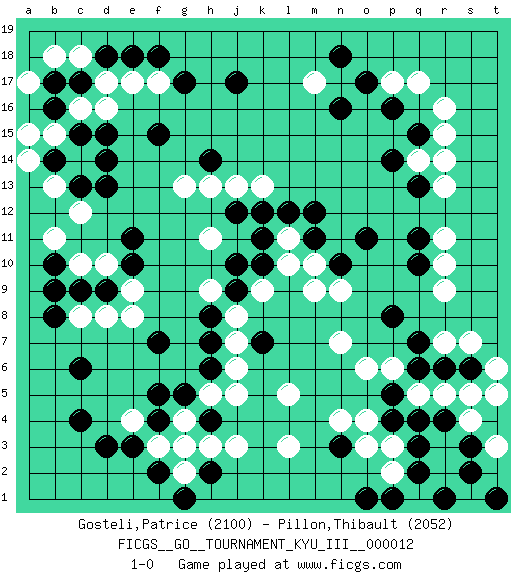 Last move : 1-0 2010 October 23 19:15:24 [Event "FICGS__GO__TOURNAMENT_KYU_III__000012"] [Site "FICGS"] [Date "2010.09.24"] [Round "1"] [Black "Gosteli,Patrice"] [White "Pillon,Thibault"] [Result "1-0"] [Rating 1 "2100"] [Rating 2 "2052"] 1.k10 d16 2.q4 r16 3.c4 e4 4.p16 p17 5.e3 f3 6.o17 q17 7.d3 g4 8.n16 l3 9.j17 r14 10.c6 d10 11.d13 f17 12.n3 l5 13.f15 b15 14.c17 c16 15.f18 e17 16.e18 c18 17.d18 d17 18.g17 r9 19.q15 r15 20.f5 c12 21.b17 b18 22.b14 c14 23.c13 b13 24.b10 b11 25.d14 r5 26.c15 a14 27.b16 a15 28.d15 a17 29.f4 g3 30.r4 s4 31.s3 s5 32.q10 r10 33.q11 r11 34.q13 q14 35.p14 r13 36.o11 h11 37.j12 p3 38.q3 p2 39.q2 o4 40.p1 n4 41.p4 o3 42.o1 p6 43.p8 t2 44.s2 t3 45.q6 q5 46.p5 o6 47.q7 r7 48.r6 s7 49.s6 t6 50.t1 s1 51.r1 t5 52.t1 n7 53.t4 t3 54.g5 h5 55.h6 j6 56.f2 g2 57.h4 j5 58.h2 h3 59.g1 j3 60.k7 c8 61.c9 d8 62.d9 e9 63.b8 m10 64.n10 m9 65.m11 g13 66.h14 k9 67.e10 c10 68.b9 e8 69.e11 l11 70.k11 l10 71.l12 h13 72.j9 n9 73.h7 j13 74.m12 j8 75.h8 h9 76.j10 j7 77.f7 m17 78.n18 k13 79.k12 1-0 Here are the names of the openings (joseki) played in the four corners : Corner d4 : c4 e4 Komoku (Somok, Xiao~mu`) 3-4 Point. The komoku (3-4) point is the traditional corner enclosure move.. Ikken Takagakari (Hankan Nop'dakeolch'im, Yi Gaogua`jiao~, 1-Space High Approach). The 5-4 approach move has become more popular in modern times, as modern Go emphasizes speed and influence. Corner q16 : r16 p16 Komoku (Somok, Xiao~mu`) 3-4 Point. The komoku (3-4) point is the traditional corner enclosure move.. Ikken Takagakari (Hankan Nop'dakeolch'im, Yi Gaogua`jiao~, 1-Space High Approach). The 5-4 approach move has become more popular in modern times, as modern Go emphasizes speed and influence. Corner q4 : q4 l3 Hoshi (Hwajeom, Seongjeom, Xingwei`) 4-4 Point. The star or hoshi (4-4) point, emphasizing influence at the potential expense of territory. Corner d16 : d16 j17 Hoshi (Hwajeom, Seongjeom, Xingwei`) 4-4 Point. The star or hoshi (4-4) point, emphasizing influence at the potential expense of territory. Player Black won this Go (weiqi, baduk) game. Follow this game move after move (download)Don't get surrounded ! Ever ! (Anonymous) The difference between stupidity and genius is that genius has its limits. (Murphy)