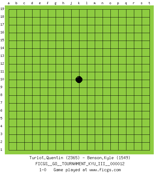 Last move : 1-0 2010 October 24 22:14:50 [Event "FICGS__GO__TOURNAMENT_KYU_III__000012"] [Site "FICGS"] [Date "2010.09.24"] [Round "1"] [Black "Turlot,Quentin"] [White "Benson,Kyle"] [Result "1-0"] [Rating 1 "2365"] [Rating 2 "1549"] 1.k10 1-0 This go game has been lost on time (started : 2010.09.24 19:34:3) Here are the names of the openings (joseki) played in the four corners : Player Black won this Go (weiqi, baduk) game. Follow this game move after move (download)Avoid the plate connection. (Anonymous) Luck is the residue of design. (John Milton)