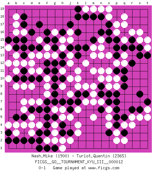 Last move : 0-1 2010 November 28 23:57:45 [Event "FICGS__GO__TOURNAMENT_KYU_III__000012"] [Site "FICGS"] [Date "2010.09.24"] [Round "1"] [Black "Nash,Mike"] [White "Turlot,Quentin"] [Result "0-1"] [Rating 1 "1900"] [Rating 2 "2365"] 1.q16 e4 2.c17 r5 3.d10 d13 4.c15 e15 5.c13 c12 6.d14 e13 7.e14 b13 8.c14 d11 9.g15 f14 10.f15 f13 11.k16 c4 12.q3 o4 13.q5 q4 14.p4 r4 15.p5 p3 16.r6 q2 17.s6 o5 18.p7 o6 19.o7 n7 20.n8 m8 21.n9 m9 22.n6 m7 23.o3 p2 24.r14 n10 25.q10 p9 26.p6 m5 27.q9 j13 28.h3 k3 29.e2 f2 30.f3 g2 31.e3 h2 32.c2 b3 33.b2 d3 34.d2 d4 35.j3 g3 36.f4 h5 37.f5 d7 38.e6 c7 39.g7 e7 40.f7 f9 41.h4 g4 42.g5 h6 43.h7 g6 44.f6 k6 45.j7 k4 46.g9 h9 47.g10 f8 48.g8 j10 49.j11 k11 50.h10 k10 51.h13 j12 52.h12 h11 53.g11 h14 54.g14 g13 55.g12 e11 56.j14 h15 57.h16 j15 58.k14 g16 59.f16 j16 60.j17 q18 61.o17 o18 62.n18 p17 63.o16 r16 64.r15 p16 65.p15 q17 66.o15 q15 67.q14 n19 68.m18 m19 69.l18 l19 70.k19 o19 71.k18 q12 72.p11 p12 73.o12 o13 74.p14 o11 75.n12 n13 76.o10 n11 77.m12 p10 78.q11 m13 79.r12 l12 80.p8 s5 81.b5 b4 82.d6 c6 83.c5 d5 84.a3 a4 85.a2 t6 86.t7 t5 87.s8 s15 88.s14 s16 89.e10 f10 90.f11 d9 91.c10 b11 92.b10 c9 93.c11 d12 94.a11 b12 95.b14 b9 96.a13 a12 97.f12 a10 98.l14 t14 99.t13 t15 100.s13 a14 101.a15 n15 102.m15 n14 103.n16 o9 104.o8 o10 105.k7 l7 106.j6 j5 107.j9 k9 108.k8 j8 109.p13 m11 110.l8 b16 111.b15 c16 112.d16 b17 113.c18 b18 114.e17 l9 115.f1 j2 116.k13 m14 117.g1 h1 118.e1 q13 0-1 Here are the names of the openings (joseki) played in the four corners : Corner d16 : c17 d13 San-San (Sam-Sam, San-San) 3-3 Point. The San-San (3-3) point, emphasizing territory at the expense of influence. Corner q4 : r5 q3 Mokuhazushi (Waemok, Wai`mu`) 5-3 Point. The mokuhazushi (5-3) point was popular in the Edo period in Japan (1600 - 1867). It emphasizes influence; territorially, it is inferior to the 3-4 point. Komoku Kakari. Black 2 is the standard approach because of its solidity and stability. Player White won this Go (weiqi, baduk) game. Follow this game move after move (download)Proverbs do not apply to White. (Tero Sand) Whatever you do, don't be bored. This is absolutely the most exciting time we could have possibly hoped to be alive. And things are just starting. (From movie Waking life)
