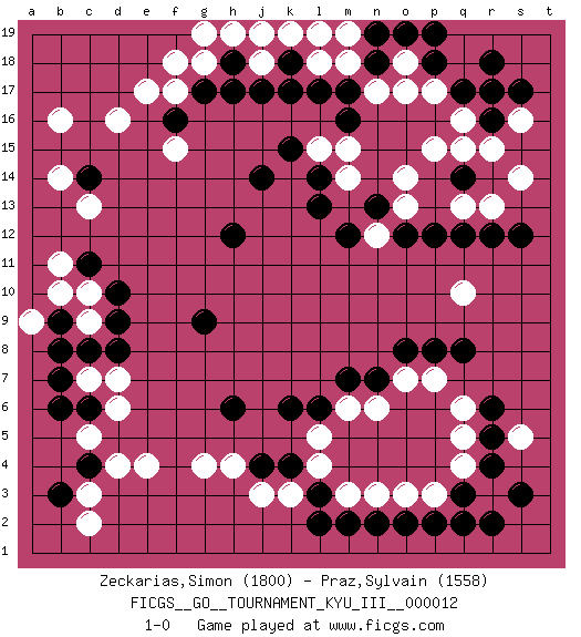 Last move : 1-0 2010 October 1 11:57:51 [Event "FICGS__GO__TOURNAMENT_KYU_III__000012"] [Site "FICGS"] [Date "2010.09.24"] [Round "1"] [Black "Zeckarias,Simon"] [White "Praz,Sylvain"] [Result "1-0"] [Rating 1 "1800"] [Rating 2 "1558"] 1.r16 d16 2.q3 p17 3.c4 q5 4.m16 r17 5.s17 q16 6.r18 r15 7.q17 s16 8.r17 p15 9.p18 o17 10.n18 q10 11.q14 q15 12.q12 s14 13.s12 o18 14.o19 n17 15.m17 m18 16.n19 l18 17.k17 j18 18.k18 k19 19.l19 m19 20.p19 j19 21.l17 r13 22.r12 q13 23.p12 o14 24.q8 p3 25.p2 r3 26.r2 q4 27.q2 o3 28.s3 s5 29.r4 e4 30.l3 j3 31.o2 n3 32.n2 m3 33.m2 l4 34.k4 k3 35.l2 l5 36.j4 h4 37.k6 g4 38.h6 d6 39.l6 m6 40.m7 n6 41.n7 c3 42.c6 c7 43.b3 c2 44.b7 c5 45.b6 d4 46.c8 d7 47.c11 f17 48.c14 b16 49.r5 q6 50.r6 o7 51.o8 p7 52.p8 n12 53.n13 o13 54.o12 m15 55.m12 l19 56.h17 g18 57.h18 h19 58.j17 g19 59.f16 e17 60.g17 f18 61.l14 m14 62.l13 l15 63.k15 c13 64.j14 b14 65.g9 c10 66.d10 c9 67.d9 b11 68.d8 b10 69.b9 a9 70.b8 f15 71.h12 1-0 Here are the names of the openings (joseki) played in the four corners : Corner q16 : r16 p17 Komoku (Somok, Xiao~mu`) 3-4 Point. The komoku (3-4) point is the traditional corner enclosure move.. Ikken Kakari (Hankan Keolch'im, Yi Gua`jiao~, 1-Space Low Pincer). The small knight move is the basic approach move to the 3-4 point stone. It has been continually used for over four centuries. There are limitless variations, with new moves constantly being discovered. White 2 opens the door to a treaure store of joseki. Corner q4 : q3 q5 Komoku (Somok, Xiao~mu`) 3-4 Point. The komoku (3-4) point is the traditional corner enclosure move.. Ikken Takagakari (Hankan Nop'dakeolch'im, Yi Gaogua`jiao~, 1-Space High Approach). The 5-4 approach move has become more popular in modern times, as modern Go emphasizes speed and influence. Corner d4 : c4 e4 Komoku (Somok, Xiao~mu`) 3-4 Point. The komoku (3-4) point is the traditional corner enclosure move.. Ikken Takagakari (Hankan Nop'dakeolch'im, Yi Gaogua`jiao~, 1-Space High Approach). The 5-4 approach move has become more popular in modern times, as modern Go emphasizes speed and influence. Player Black won this Go (weiqi, baduk) game. Follow this game move after move (download)The comb formation is alive. (Anonymous) A good teacher is like a candle - it consumes itself to light the way for others. (Author unknown)