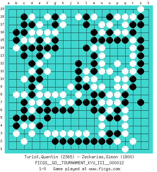 Last move : 1-0 2010 November 7 22:50:33 [Event "FICGS__GO__TOURNAMENT_KYU_III__000012"] [Site "FICGS"] [Date "2010.09.24"] [Round "1"] [Black "Turlot,Quentin"] [White "Zeckarias,Simon"] [Result "1-0"] [Rating 1 "2365"] [Rating 2 "1800"] 1.q15 d4 2.c16 q4 3.l17 q17 4.o16 r15 5.r16 q16 6.r17 r18 7.s18 q18 8.s15 r14 9.s14 r13 10.p15 n17 11.m16 s19 12.s17 m18 13.o18 o17 14.l18 n16 15.n15 p16 16.o15 p18 17.s13 r12 18.s12 r11 19.r9 q9 20.q8 p9 21.r10 q10 22.s11 p8 23.q7 p7 24.p6 q6 25.s7 o6 26.p5 q5 27.o5 n5 28.p3 n4 29.o3 q3 30.q2 r2 31.m2 p2 32.o2 q1 33.n6 o7 34.m6 l3 35.l2 n3 36.n2 k3 37.k2 j3 38.j2 h3 39.h2 g3 40.p11 q11 41.n8 n11 42.n10 m10 43.o10 p12 44.m11 n12 45.m12 n13 46.m13 n7 47.m7 m14 48.l14 n14 49.m15 m9 50.m8 l11 51.k12 n9 52.o9 o8 53.k10 l10 54.k11 o11 55.d9 e17 56.d17 e16 57.g17 c15 58.b15 d16 59.c17 g16 60.c14 h17 61.g18 d15 62.d14 e14 63.e13 f13 64.f14 f15 65.g14 d13 66.e15 b14 67.c13 f18 68.b16 h18 69.e14 d18 70.g15 f16 71.c18 k18 72.g2 f3 73.c6 d6 74.c5 c4 75.d5 e5 76.b4 b3 77.b5 d7 78.e6 e7 79.f6 e9 80.d10 g8 81.f7 f8 82.h6 h7 83.l9 p10 84.j6 b8 85.c7 c8 86.d8 e8 87.g6 k8 88.j8 j7 89.k7 j9 90.k9 h8 91.l7 c10 92.c3 d11 93.e10 d3 94.e4 c2 95.f5 f11 96.e11 e12 97.d12 1-0 Here are the names of the openings (joseki) played in the four corners : Corner q4 : q4 r9 Hoshi (Hwajeom, Seongjeom, Xingwei`) 4-4 Point. The star or hoshi (4-4) point, emphasizing influence at the potential expense of territory. Corner d16 : c16 e17 Komoku (Somok, Xiao~mu`) 3-4 Point. The komoku (3-4) point is the traditional corner enclosure move.. Ikken Kakari (Hankan Keolch'im, Yi Gua`jiao~, 1-Space Low Pincer). The small knight move is the basic approach move to the 3-4 point stone. It has been continually used for over four centuries. There are limitless variations, with new moves constantly being discovered. White 2 opens the door to a treaure store of joseki. Player Black won this Go (weiqi, baduk) game. Follow this game move after move (download)Big groups never die. (Anonymous) I couldn't make any sense out of what this particular thread is about. It sounds like R2 D2 computer speaking. A space fight ?!? Some 'command' problems in Moscow ? Some killers & narcotic addicts attacking some game & a god wannabe ?? (Dinesh De Silva, lost in a russian conflict in FICGS forum)