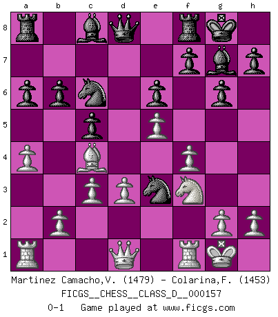 Last move : 0-1 2010 October 15 19:38:55 [Event "FICGS__CHESS__CLASS_D__000157"] [Site "FICGS"] [Date "2010.09.25"] [Round "1"] [White "Martinez Camacho,Victor Hugo"] [Black "Colarina,Floram"] [Result "0-1"] [WhiteElo "1479"] [BlackElo "1453"] 1.e4 c5 2.f4 Nc6 3.Nc3 g6 4.Nf3 Bg7 5.Bc4 e6 6.O-O a6 7.a4 Nge7 8.d3 O-O 9.Be3 b6 10.e5 d5 11.Nxd5 Nxd5 12.c3 Nxe3 0-1 Sicilian : Grand Prix attack Kingside Castling by player White (move 6) Kingside Castling by player Black (move 8) Player Black won this chess game. Follow this game move after move (download)Though most people love to look at the games of the great attacking masters, some of the most successful players in history have been the quiet positional players. They slowly grind you down by taking away your space, tying up your pieces, and leaving you with virtually nothing to do ! (Yasser Seirawan) Nicht daß Diemer aus Opportunismus Mitglied der NSDAP geworden wäre. Er war ein Fanatiker, in allem, was er tat. (Hans Ree) El Ajedrez es un invernadero donde los frutos del carácter pueden madurar mas completamente que en la vida. (Edward Morgan Foster) Aux échecs, l'amour-propre est satisfait quand on remporte la victoire, mais il n'y a pas de honte à être battu. (Benjamin Franklin) If we don't succeed, we run the risk of failure. (George W. Bush)