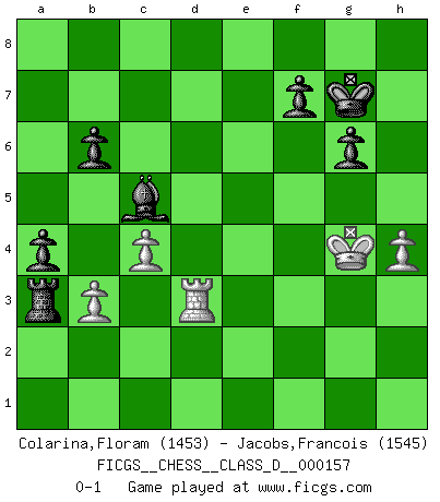 Last move : 0-1 2010 December 11 4:40:42 [Event "FICGS__CHESS__CLASS_D__000157"] [Site "FICGS"] [Date "2010.09.25"] [Round "1"] [White "Colarina,Floram"] [Black "Jacobs,Francois"] [Result "0-1"] [WhiteElo "1453"] [BlackElo "1545"] 1.d4 Nf6 2.c4 g6 3.Nc3 Bg7 4.Nf3 O-O 5.Bf4 d6 6.e4 c5 7.Be2 cxd4 8.Nxd4 e5 9.Ndb5 exf4 10.Nxd6 Ne8 11.Nxc8 Qxc8 12.Nd5 Nc6 13.Rb1 Nf6 14.f3 Nxd5 15.exd5 Rd8 16.O-O Ne7 17.Qc1 Bd4+ 18.Kh1 Be3 19.Qc3 b6 20.Bd3 Qc7 21.Be4 Rac8 22.b3 Nxd5 23.Bxd5 Rxd5 24.Qf6 Bd4 25.Qh4 Rh5 26.Qe1 Qc5 27.g3 fxg3 28.Qxg3 Be5 29.f4 Bf6 30.Rbd1 Re8 31.Rd2 Qf5 32.Qf3 Rh3 33.Qg2 Rd3 34.Rdf2 Bd4 35.Rd2 Rxd2 36.Qxd2 Qe4+ 37.Qg2 Qxg2+ 38.Kxg2 Re2+ 39.Kg3 Rxa2 40.h4 a5 41.f5 Kg7 42.fxg6 hxg6 43.Rd1 Bc5 44.Rd3 Ra3 45.Kg4 a4 0-1 King's Indian defense, 3.Nc3 Kingside Castling by player Black (move 4) Kingside Castling by player White (move 16) Player Black won this chess game. Follow this game move after move (download)Dazzling combinations are for the many, shifting wood is for the few. (Georg Kieninger) Viele Opfer benötigen überhaupt keine konkrete Berechnung. Es genügt sich die entstehende Position kurz vorzustellen, um uns davon zu überzeugen, dass das Opfer korrekt ist. (Mikhail Nekhemyevich Tal) Las Aperturas te enseñan aperturas. ¡Los Finales te enseñan Ajedrez!. (Stephan Gerzadowicz) Il n'y a pas eu de défaite parce que je ne crois pas que cet ordinateur ait jamais existé. IBM a triché en refusant d'imprimer les modes de recherche de la machine. C'est évident, pendant le match, des coups décisifs ont été joués par des êtres humains. Aujourd'hui, les meilleurs spécialistes en informatique ne peuvent toujours pas expliquer comment Deep-Blue a pu jouer contre la logique des ordinateurs. IBM a gagné une guerre de communication, mais ils sont incapables de prouver que l'ordinateur a gagné tout seul. (Garry Kasparov) Bobby never cared about money, though. His only desire was to prove that his choices were correct: He wanted chess to be important because he was a chess player, and he wanted to be important. Bobby knew money was important, but he didn't have a clue why, outside of clothes and status. The only way he could accomplish what he wanted was to fight for a lot of money. Once he got it, he gave it away. He did not know how to spend it. And once he'd become champion, after, essentially, sacrificing his life for it, he didn't know how to spend his time. (Bob Wade)