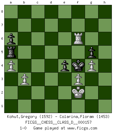 Last move : 1-0 2011 May 9 10:47:16 [Event "FICGS__CHESS__CLASS_D__000157"] [Site "FICGS"] [Date "2010.09.25"] [Round "1"] [White "Kohut,Gregory"] [Black "Colarina,Floram"] [Result "1-0"] [WhiteElo "1592"] [BlackElo "1453"] 1.e4 e5 2.Nf3 Nc6 3.Bb5 a6 4.Ba4 Be7 5.O-O b5 6.Bb3 Nf6 7.Re1 O-O 8.c3 Na5 9.Nxe5 Nxb3 10.Qxb3 Bb7 11.d3 d6 12.Nf3 c5 13.Bg5 Nd7 14.Bxe7 Qxe7 15.Nbd2 Ne5 16.Nxe5 dxe5 17.Qc2 f5 18.f3 Rac8 19.exf5 Rxf5 20.d4 Rh5 21.dxc5 Qh4 22.h3 Rxc5 23.Ne4 Bxe4 24.Rxe4 Qf6 25.Rae1 g6 26.Qd2 Rf5 27.Rd1 g5 28.Qd8+ Qxd8 29.Rxd8+ Kg7 30.Rd6 Rf6 31.Rxf6 Kxf6 32.Kf2 Rd5 33.Ke2 h5 34.b3 Rc5 35.c4 bxc4 36.Rxc4 Ra5 37.a4 Ke6 38.Rc6+ Kf5 39.g4+ hxg4 40.hxg4+ Kf4 41.Kf2 e4 42.Rf6+ 1-0 Ruy Lopez Kingside Castling by player White (move 5) Kingside Castling by player Black (move 7) Player White won this chess game. Follow this game move after move (download)My style is somewhere between that of Tal and Petrosian. (Reshevsky) Ich hatte Zahnschmerzen im ersten Spiel. In der zweiten Partie tat mir der Kopf weh. In der dritten war es eine Rheuma-Attacke und während der vierten fühlte ich mich nicht gut. Und in der fünften? Nun, man muss doch nicht jedes Spiel gewinnen, oder? (Savielly Grigorievitsch Tartakower) El hombre es un frívolo, una creatura engañosa y como un jugador de Ajedrez, se preocupa mas por el proceso de obtener su meta que de la meta por sí misma. (Dostoyevsky) Nous vivons dans un monde échiquéen : chaque jour qui passe est un défi à relever. (Philosophe Sasha) I find your interest interesting. (Gregory House, House M.D.)