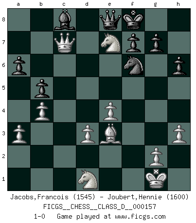 Last move : 1-0 2010 October 12 12:40:12 [Event "FICGS__CHESS__CLASS_D__000157"] [Site "FICGS"] [Date "2010.09.25"] [Round "1"] [White "Jacobs,Francois"] [Black "Joubert,Hennie"] [Result "1-0"] [WhiteElo "1545"] [BlackElo "1600"] 1.e4 c5 2.Nf3 e6 3.d4 cxd4 4.Nxd4 Nf6 5.Nc3 d6 6.Be2 a6 7.O-O Be7 8.Be3 O-O 9.Qd2 b5 10.a3 Bb7 11.Bd3 h6 12.h3 Nbd7 13.b4 Ne5 14.f4 Nxd3 15.cxd3 Rc8 16.Rac1 Qd7 17.Qe2 Rc7 18.Rc2 Rfc8 19.Rfc1 e5 20.Nf3 Kh8 21.fxe5 dxe5 22.Nxe5 Qe8 23.Nd1 Rxc2 24.Rxc2 Rxc2 25.Qxc2 Kg8 26.Qc7 Bc8 27.Nc6 Kf8 28.Nxe7 1-0 Sicilian : Anderssen variation Kingside Castling by player White (move 7) Kingside Castling by player Black (move 8) Player White won this chess game. Follow this game move after move (download)Chess is no whit inferior to the violin, and we have a large number of professional violinists. (Mikhail Botvinnik) Wenn ich gewinne bin ich ein Genie. Wenn nicht, dann bin ich keines. (Robert James Fischer) Siempre es mejor sacrificar los hombres de tu oponente. (Savielly Tartakower) Votre seul travail dans les ouvertures est d'obtenir un milieu de partie jouable. (Lajos Portish) Experience is the name we all give to our mistakes. (Oscar Wilde)