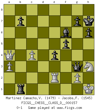 Last move : 0-1 2010 November 29 18:58:54 [Event "FICGS__CHESS__CLASS_D__000157"] [Site "FICGS"] [Date "2010.09.25"] [Round "1"] [White "Martinez Camacho,Victor Hugo"] [Black "Jacobs,Francois"] [Result "0-1"] [WhiteElo "1479"] [BlackElo "1545"] 1.e4 c5 2.f4 d5 3.exd5 Qxd5 4.Nc3 Qd8 5.Nf3 Nc6 6.Bb5 Bd7 7.O-O Nf6 8.d3 e6 9.Be3 Be7 10.Qe1 Qc7 11.Ne4 Nb4 12.Bxd7+ Nxd7 13.Qd2 O-O 14.a3 Nd5 15.Bf2 h6 16.c4 N5f6 17.Rad1 Rad8 18.Kh1 Nxe4 19.dxe4 Nf6 20.Qc2 Qxf4 21.Rde1 Qc7 22.Bg3 Qc8 23.b3 Nh5 24.Bf2 Nf4 25.Bg3 Nh5 26.Bf2 Rd7 27.Qe2 Nf4 28.Qe3 Ng6 29.Bg3 f6 30.Rc1 Rfd8 31.Rc2 e5 32.Bf2 Rd3 33.Qc1 Qg4 34.Bg3 Qxe4 35.Re1 Qc6 36.Rb2 e4 37.Ng1 f5 38.Bf2 Bg5 39.Qc2 Nf4 40.Bg3 Rxg3 41.hxg3 Nd3 42.Re2 Nxb2 43.Qxb2 Qd6 44.Qc3 Qg6 45.Nh3 Bf6 46.Qe3 Rd3 47.Qxc5 Rxb3 48.Qxa7 Qxg3 49.Qa8+ Kh7 50.Qa4 Rb1+ 0-1 Sicilian : Grand Prix attack Kingside Castling by player White (move 7) Kingside Castling by player Black (move 13) Player Black won this chess game. Follow this game move after move (download)Later, I began to succeed in decisive games. Perhaps because I realized a very simple truth: not only was I worried, but also my opponent. (Mikhail Tal) Immer nach dem besten Zug zu suchen ist ziemlich unpraktisch. (Nigel Short) Un buen sacrificio es aquel que aunque no sea necesariamente sólido, deja a tu oponente aturdido y confuso. (Rudolph Spielmann) Un millionnaire : 'Monsieur Steinitz ! Vous ne participez aux tournois que pour l'argent, alors que moi je n'y viens que pour l'honneur.' Steinitz : 'Chacun joue pour ce qu'il n'a pas'... We cannot be sure of having something to live for unless we are willing to die for it. (Ernesto Che Guevara)
