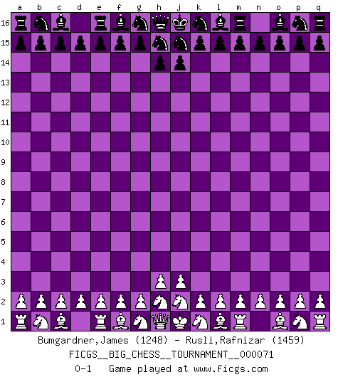Last move : 0-1 2010 October 25 10:21:6 [Event "FICGS__BIG_CHESS__TOURNAMENT__000071"] [Site "FICGS"] [Date "2010.09.25"] [Round "1"] [White "Bumgardner,James"] [Black "Rusli,Rafnizar"] [Result "0-1"] [WhiteElo "1248"] [BlackElo "1459"] 0-1 This big chess game has been lost on time (started : 2010.09.25 4:15:25) Follow this game move after move (download)Chess holds its master in its own bonds, shackling the mind and brain so that the inner freedom of the very strongest must suffer. (Albert Einstein) Die Idee von Capablanca, Schach als Fach in den Schulen zu lehren, ist großartig. (Fidel Castro) Debemos de asegurarnos de que el Ajedrez no se convierta en un lenguaje muerto, muy interesante, pero solo para un grupo muy pequeño. (Sytze Faber) Le joueur d'Echecs qui veut atteindre le top est obligé de développer son propre credo créatif. Alexeï Stepanovicth Souétine. Il est facile d'écrire des livres ! Ce qui est difficile, c'est de jouer ! (Alexeï Stepanovicth Souétine) The only difference between a tax man and a taxidermist is that the taxidermist leaves the skin. (Mark Twain)