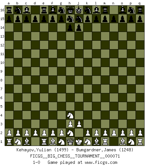 Last move : 1-0 2010 October 25 22:20:25 [Event "FICGS__BIG_CHESS__TOURNAMENT__000071"] [Site "FICGS"] [Date "2010.09.25"] [Round "1"] [White "Kehayov,Yulian"] [Black "Bumgardner,James"] [Result "1-0"] [WhiteElo "1499"] [BlackElo "1248"] 1.j2-h4 1-0 This big chess game has been lost on time (started : 2010.09.25 4:15:25) Follow this game move after move (download)Avoid the crowd. Do your own thinking independently. Be the Chess player, not the Chess piece. (Ralph Charell) Der 70jährige Viktor Kortschnoi: Die Rentenanstalt wollte mich zwingen in Rente zu gehen. Meine Frau erhält jetzt eine Pension- und ich zahle weiter in die Rentenkasse ein! (Viktor Kortschnoi) Ayuda a tus piezas para que ellas te puedan ayudar. (Paul Morphy) Il n'y a pas eu de défaite parce que je ne crois pas que cet ordinateur ait jamais existé. IBM a triché en refusant d'imprimer les modes de recherche de la machine. C'est évident, pendant le match, des coups décisifs ont été joués par des êtres humains. Aujourd'hui, les meilleurs spécialistes en informatique ne peuvent toujours pas expliquer comment Deep-Blue a pu jouer contre la logique des ordinateurs. IBM a gagné une guerre de communication, mais ils sont incapables de prouver que l'ordinateur a gagné tout seul. (Garry Kasparov) At work, the authority of a person is inversely proportional to the number of pens that person is carrying. (Dan Rotaru)