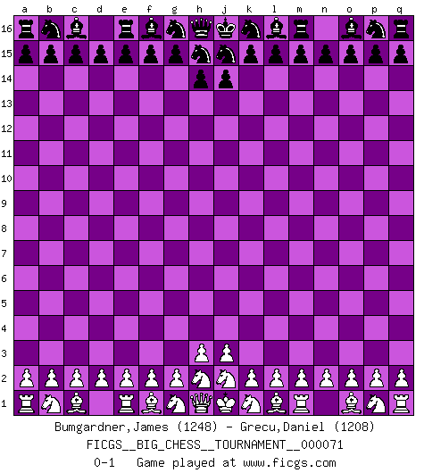 Last move : 0-1 2010 October 25 10:21:6 [Event "FICGS__BIG_CHESS__TOURNAMENT__000071"] [Site "FICGS"] [Date "2010.09.25"] [Round "1"] [White "Bumgardner,James"] [Black "Grecu,Daniel"] [Result "0-1"] [WhiteElo "1248"] [BlackElo "1208"] 0-1 This big chess game has been lost on time (started : 2010.09.25 4:15:25) Follow this game move after move (download)Fischer is an American Chess tragedy on par with Morphy and Pillsbury. (Mig Greengard) Ein unbeabsichtigtes Patt ist der Gipfel der Dummheit. (Anonymous) El poder defensivo de una pieza clavada, solamente es imaginario. (Aaron Nimzovich) RxDa4 pat (...) Art is not a thing, it is a way. (Elbert Hubbard)