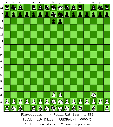 Last move : 1-0 2010 October 25 22:20:25 [Event "FICGS__BIG_CHESS__TOURNAMENT__000071"] [Site "FICGS"] [Date "2010.09.25"] [Round "1"] [White "Flores,Luis"] [Black "Rusli,Rafnizar"] [Result "1-0"] [WhiteElo ""] [BlackElo "1459"] 1.p1-o3 1-0 This big chess game has been lost on time (started : 2010.09.25 4:15:25) Follow this game move after move (download)Many Chess players were surprised when after the game, Fischer quietly explained: 'I had already analyzed this possibility' in a position which I thought was not possible to foresee from the opening. (Mikhail Tal) Kombinieren und Schwarzhandel gehören verboten. (Savielly Grigorievitsch Tartakower) Si tu oponente te ofrece un empate, trata de averiguar porque piensa él que esta en una posición peor. (Nigel Short) La tactique est l'élément le plus important du milieu de jeu. (Siegbert Tarrasch) Life doesn't imitate art, it imitates bad television. (Woody Allen)