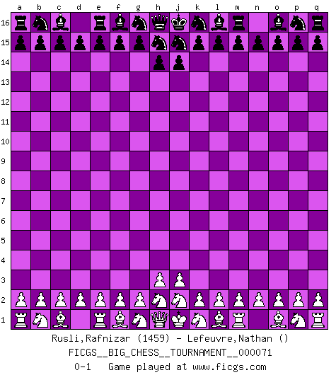 Last move : 0-1 2010 October 25 10:21:6 [Event "FICGS__BIG_CHESS__TOURNAMENT__000071"] [Site "FICGS"] [Date "2010.09.25"] [Round "1"] [White "Rusli,Rafnizar"] [Black "Lefeuvre,Nathan"] [Result "0-1"] [WhiteElo "1459"] [BlackElo ""] 0-1 This big chess game has been lost on time (started : 2010.09.25 4:15:25) Follow this game move after move (download)Chess is a terrible game. If you have no center, your opponent has a freer position. If you do have a center, then you really have something to worry about ! (Siegbert Tarrasch) Wenn ich einen Club besuche, sind die Spieler stumm vor Staunen. (José Raúl Capablanca) Los libros de Ajedrez deben de usarse igual como usamos los anteojos: para mejorar la vista, aunque algunos jugadores los quieren usar como si ellos les otorgaran la vision. (José Raúl Capablanca) Le temps de noter son nom sur la feuille de partie, j'étais déjà en zeitnot ! D'un modeste amateur apparié lors de la première ronde d'un open contre le grand-maître Azmaïparashvili. They misunderestimated me. (George W. Bush, Bentonville nov. 6, 2000)