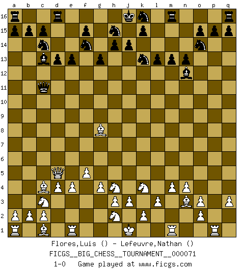 Last move : 1-0 2010 December 1 10:21:5 [Event "FICGS__BIG_CHESS__TOURNAMENT__000071"] [Site "FICGS"] [Date "2010.09.25"] [Round "1"] [White "Flores,Luis"] [Black "Lefeuvre,Nathan"] [Result "1-0"] [WhiteElo ""] [BlackElo ""] 1.p1-o3 g15-g13 2.g2-g4 h16-c11 3.b1-c3 g16-f14 4.k1-l3 p16-o14 5.j2-k4 n15-n13 6.h1-d5 m15-m13 7.g1-f3 j15-k13 8.n2-n4 e15-e13 9.o1-g8 l15-l14 10.m2-m4 f16-c13 11.l1-n3 l16-o13 12.e2-e4 d15-d13 13.f1-c4 c16-p4 14.q2-q3 p4-o3 15.p2-o3 o16-c5 16.d2-d4 c5-f8 17.l3-j2 o13-g6 18.f3-h4 g6-n12 19.q1-p1 f8-k4 20.j2-k4 b16-c14 21.f2-f4 e16-d16 22.f4-f5 l14-l13 23.l2-l3 1-0 This big chess game has been lost on time (started : 2010.09.25 4:15:25) Follow this game move after move (download)The battle for the ultimate truth will never be won. And that's why Chess is so fascinating. (Hans Kmoch) Um dein Spiel zu verbessern musst du zuallererst das Endspiel studieren, denn diese kann unabhängig studiert werden. Die Eröffnung und das Mittelspiel müssen immer in Bezug gesetzt werden zum Endspiel. (José Raúl Capablanca) No todos los artistas son jugadores de Ajedrez, pero todos los jugadores de Ajedrez son artistas. (Marcel Duchamp) Un millionnaire : 'Monsieur Steinitz ! Vous ne participez aux tournois que pour l'argent, alors que moi je n'y viens que pour l'honneur.' Steinitz : 'Chacun joue pour ce qu'il n'a pas'... If you work for a living, why do you kill yourself working ? (Tuco to a chicken in The Good, The Bad and The Ugly)