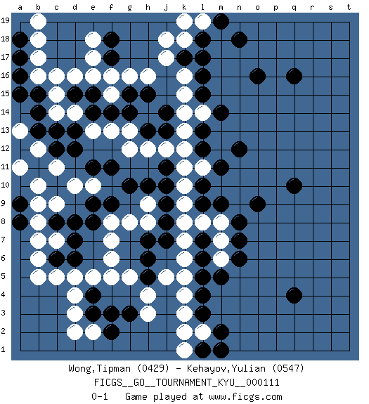 Last move : 0-1 2011 March 3 10:7:30 [Event "FICGS__GO__TOURNAMENT_KYU__000111"] [Site "FICGS"] [Date "2010.09.26"] [Round "1"] [Black "Wong,Tipman"] [White "Kehayov,Yulian"] [Result "0-1"] [Rating 1 "0429"] [Rating 2 "0547"] 1.q16 c5 2.q4 d16 3.q10 k4 4.l3 k3 5.m5 k6 6.l6 k7 7.l7 k9 8.l9 k10 9.l10 k12 10.l12 k13 11.l13 k15 12.l15 k16 13.l16 k18 14.l18 d10 15.k17 j17 16.l17 j18 17.j14 k14 18.g14 h16 19.h15 g16 20.e15 e16 21.d15 c14 22.d13 f13 23.e11 e10 24.f11 g13 25.h13 h12 26.j13 g12 27.g10 f15 28.f14 d14 29.g15 f16 30.e14 e13 31.d12 c15 32.j9 k8 33.d8 c9 34.c8 c11 35.c12 b12 36.b11 b10 37.b13 a11 38.c13 b8 39.a9 b9 40.a8 b7 41.c6 b6 42.f9 f7 43.j11 j12 44.h7 f6 45.d6 d5 46.e8 f8 47.e9 k11 48.j10 h8 49.j8 g8 50.j7 h9 51.h10 f5 52.h5 j5 53.l4 c7 54.d7 h4 55.b14 b16 56.b15 c16 57.a16 b17 58.a17 b18 59.a18 g5 60.h6 k5 61.l5 l2 62.m2 k2 63.l1 k1 64.m1 l19 65.m19 k19 66.n18 d3 67.o16 l8 68.m9 m8 69.n8 m7 70.n7 l11 71.m11 l14 72.m14 m6 73.n6 b5 74.o9 b19 75.a15 a13 76.n12 pass 77.f17 e17 78.f18 e18 79.f3 e2 80.e4 e5 81.e3 d4 82.f2 d2 83.g3 h3 84.pass pass 85.pass pass 0-1 Here are the names of the openings (joseki) played in the four corners : Corner d4 : c5 j9 Mokuhazushi (Waemok, Wai`mu`) 5-3 Point. The mokuhazushi (5-3) point was popular in the Edo period in Japan (1600 - 1867). It emphasizes influence; territorially, it is inferior to the 3-4 point. Player White won this Go (weiqi, baduk) game. Follow this game move after move (download)Good moves and bad moves are bedfellows. (Anonymous) The production of too many useful things results in too many useless people. (Karl Marx)