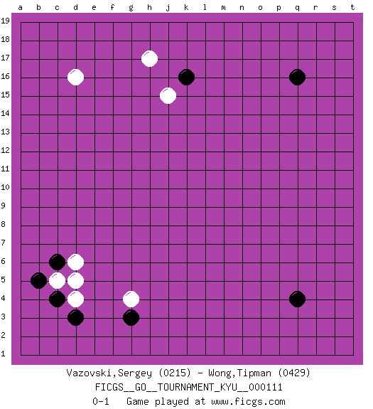 Last move : 0-1 2010 November 8 9:52:5 [Event "FICGS__GO__TOURNAMENT_KYU__000111"] [Site "FICGS"] [Date "2010.09.26"] [Round "1"] [Black "Vazovski,Sergey"] [White "Wong,Tipman"] [Result "0-1"] [Rating 1 "0215"] [Rating 2 "0429"] 1.q16 d4 2.q4 d16 3.g3 h17 4.k16 j15 5.d3 g4 6.c4 d6 7.c6 c5 8.b5 d5 0-1 This go game has been lost on time (started : 2010.09.26 2:55:35) Here are the names of the openings (joseki) played in the four corners : Corner d4 : d4 g3 Hoshi (Hwajeom, Seongjeom, Xingwei`) 4-4 Point. The star or hoshi (4-4) point, emphasizing influence at the potential expense of territory. Niken Kakari (Dukan Keolch'im, E`r Gua`jiao~, 2-Space Low Approach). White typically answers by 7-3 or 3-5 (which is not joseki). Player White won this Go (weiqi, baduk) game. Follow this game move after move (download)The nature of a game comes from what is played, but it's the sensitivity to the possible and the impossible that gives it value. (Pierre Audouard) I believe in luck. How else can you explain the success of those you dislike ? (Jean Cocteau)