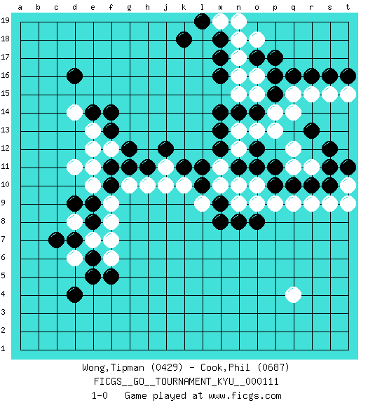 Last move : 1-0 2011 March 26 12:53:1 [Event "FICGS__GO__TOURNAMENT_KYU__000111"] [Site "FICGS"] [Date "2010.09.26"] [Round "1"] [Black "Wong,Tipman"] [White "Cook,Phil"] [Result "1-0"] [Rating 1 "0429"] [Rating 2 "0687"] 1.q16 q4 2.d4 q14 3.d16 d14 4.e14 d6 5.f5 f7 6.e6 e7 7.d7 d8 8.c7 d11 9.f11 e11 10.e8 f6 11.e5 f8 12.e9 f9 13.d9 e10 14.f10 g10 15.g11 h10 16.j12 j11 17.h11 k10 18.k11 j10 19.l11 m11 20.m12 n12 21.n11 m10 22.l10 l9 23.m9 n10 24.o11 o10 25.o12 n13 26.m13 n15 27.n14 o13 28.o14 p13 29.p11 q11 30.p10 n9 31.m8 p9 32.q10 q12 33.n8 o9 34.o8 q9 35.r10 r9 36.s10 s9 37.s12 o15 38.p15 p14 39.m14 q15 40.p16 o16 41.r16 r11 42.s11 r15 43.s16 s15 44.t16 t15 45.r13 t10 46.t11 t9 47.o17 n17 48.m16 o18 49.p17 n16 50.m17 n18 51.m18 m19 52.l19 n19 53.k18 e12 54.f13 f12 55.g12 e13 56.f14 1-0 This go game has been lost on time (started : 2010.09.26 2:55:35) Here are the names of the openings (joseki) played in the four corners : Corner q16 : q16 q14 Hoshi (Hwajeom, Seongjeom, Xingwei`) 4-4 Point. The star or hoshi (4-4) point, emphasizing influence at the potential expense of territory. Ikken Takagakari (Hankan Nop'dakeolch'im, Yi Gaojia, 1-Space High Approach). Black typically responds at 6-4 or 3-10. Black 4-10 is played when Black finds play on the right side advantageous. Black 4-8 or 3-8 may be played when Black has support at top. Corner d16 : d16 d14 Hoshi (Hwajeom, Seongjeom, Xingwei`) 4-4 Point. The star or hoshi (4-4) point, emphasizing influence at the potential expense of territory. Ikken Takagakari (Hankan Nop'dakeolch'im, Yi Gaojia, 1-Space High Approach). Black typically responds at 6-4 or 3-10. Black 4-10 is played when Black finds play on the right side advantageous. Black 4-8 or 3-8 may be played when Black has support at top. Corner d4 : d4 d6 Hoshi (Hwajeom, Seongjeom, Xingwei`) 4-4 Point. The star or hoshi (4-4) point, emphasizing influence at the potential expense of territory. Ikken Takagakari (Hankan Nop'dakeolch'im, Yi Gaojia, 1-Space High Approach). Black typically responds at 6-4 or 3-10. Black 4-10 is played when Black finds play on the right side advantageous. Black 4-8 or 3-8 may be played when Black has support at top. Player Black won this Go (weiqi, baduk) game. Follow this game move after move (download)While the Baroque rules of chess could only have been created by humans, the rules of go are so elegant, organic, and rigorously logical that if intelligent life forms exist elsewhere in the universe, they almost certainly play go. (Edward Lasker, international chess master) You know what they say : You lie down with the Devil, you wake up in Hell. (Horatio Caine, C.S.I. Miami)