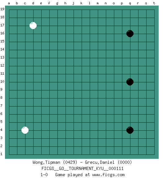 Last move : 1-0 2010 October 30 10:37:32 [Event "FICGS__GO__TOURNAMENT_KYU__000111"] [Site "FICGS"] [Date "2010.09.26"] [Round "1"] [Black "Wong,Tipman"] [White "Grecu,Daniel"] [Result "1-0"] [Rating 1 "0429"] [Rating 2 "0000"] 1.q16 c4 2.q4 d17 3.q10 1-0 This go game has been lost on time (started : 2010.09.26 2:55:35) Here are the names of the openings (joseki) played in the four corners : Corner q4 : q4 1-0 Hoshi (Hwajeom, Seongjeom, Xingwei`) 4-4 Point. The star or hoshi (4-4) point, emphasizing influence at the potential expense of territory. Player Black won this Go (weiqi, baduk) game. Follow this game move after move (download)The strong player plays straight, the weak diagonally. (Anonymous) The worth of a book is to be measured by what you can carry away from it. (James Bryce)