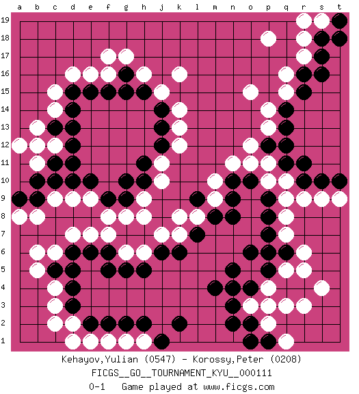 Last move : 0-1 2010 December 13 9:1:0 [Event "FICGS__GO__TOURNAMENT_KYU__000111"] [Site "FICGS"] [Date "2010.09.26"] [Round "1"] [Black "Kehayov,Yulian"] [White "Korossy,Peter"] [Result "0-1"] [Rating 1 "0547"] [Rating 2 "0208"] 1.r15 q16 2.r16 q15 3.d4 d16 4.q4 o3 5.m4 o5 6.o4 p4 7.n4 p3 8.p5 q5 9.p6 r5 10.o6 k16 11.d13 c6 12.f5 d9 13.d11 c14 14.c13 c15 15.c10 c9 16.b9 b8 17.a9 b11 18.b10 b13 19.b12 c12 20.c11 a12 21.d12 b12 22.e10 f8 23.e15 f17 24.f15 h8 25.g10 j10 26.h11 k12 27.j13 k13 28.j14 k14 29.n5 q10 30.j6 k7 31.k6 c3 32.d3 c4 33.q14 r17 34.s17 r18 35.s18 p18 36.q12 o11 37.n8 p14 38.q13 p13 39.r10 r9 40.s10 s9 41.t10 t9 42.q11 p10 43.n3 q3 44.l7 k8 45.l9 l8 46.m8 m9 47.n9 m10 48.n10 n11 49.o10 q7 50.p7 q8 51.p8 h16 52.h15 j15 53.g15 g6 54.g5 h6 55.h5 s19 56.s16 d2 57.e2 c2 58.e6 d7 59.d6 e7 60.f6 g8 61.h10 j11 62.j12 h9 63.f9 e9 64.g9 j7 65.d14 e16 66.d15 f16 67.o2 p2 68.n2 e1 69.f2 f1 70.g2 g1 71.h2 h1 72.j1 d1 73.k2 a8 74.p12 o12 75.o1 p11 76.r11 o15 77.c5 b5 78.d5 b6 79.g16 g17 80.p9 q9 81.p1 q1 82.q6 r6 83.d10 f7 84.r4 r3 85.t18 r19 86.t19 s4 0-1 Here are the names of the openings (joseki) played in the four corners : Corner q16 : r15 q16 Mokuhazushi (Waemok, Wai`mu`) 5-3 Point. The mokuhazushi (5-3) point was popular in the Edo period in Japan (1600 - 1867). It emphasizes influence; territorially, it is inferior to the 3-4 point. Corner q4 : q4 o3 Hoshi (Hwajeom, Seongjeom, Xingwei`) 4-4 Point. The star or hoshi (4-4) point, emphasizing influence at the potential expense of territory. Ikken Kakari (Hankan Keolch'im, Yi Gua`jiao~, 1-Space Low Approach). White 2 is the standard approach move to the 4-4. Corner d16 : d16 d13 Hoshi (Hwajeom, Seongjeom, Xingwei`) 4-4 Point. The star or hoshi (4-4) point, emphasizing influence at the potential expense of territory. Niken Takagakari (Dukan Nop'dakeolch'im, E`r Gaojia, 2-Space High Approach). Black 2 is a light approach move. Rarely played in even games, Black 2 is typically employed in handicap games. White continues with 6-4 or 3-10. In Korean Sunjang Baduk White has a stone on 8-4. Corner d4 : d4 c6 Hoshi (Hwajeom, Seongjeom, Xingwei`) 4-4 Point. The star or hoshi (4-4) point, emphasizing influence at the potential expense of territory. Ikken Kakari (Hankan Keolch'im, Yi Gua`jiao~, 1-Space Low Approach). White 2 is the standard approach move to the 4-4. Player White won this Go (weiqi, baduk) game. Follow this game move after move (download)The intersection is rarely neutral. (Pierre Audouard) Man is still the most extraordinary computer of all. (John F. Kennedy)