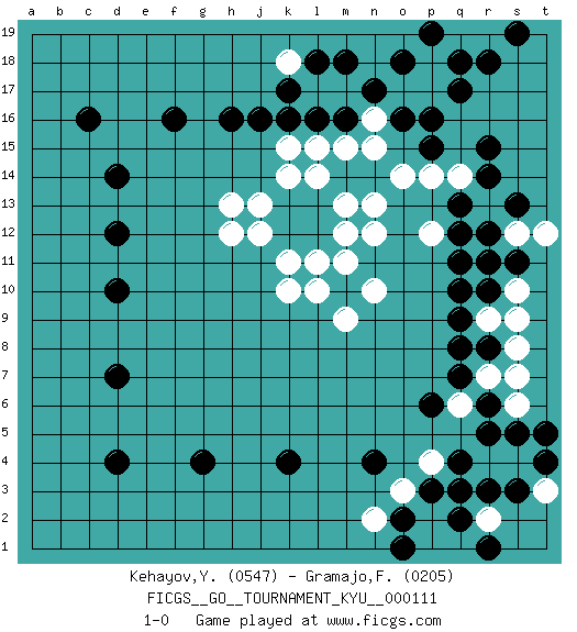 Last move : 1-0 2010 December 6 5:33:24 [Event "FICGS__GO__TOURNAMENT_KYU__000111"] [Site "FICGS"] [Date "2010.09.26"] [Round "1"] [Black "Kehayov,Yulian"] [White "Gramajo,Francisco"] [Result "1-0"] [Rating 1 "0547"] [Rating 2 "0205"] 1.r15 k10 2.c16 k11 3.q4 l10 4.d4 l11 5.q10 m12 6.k4 m11 7.d10 n12 8.k16 m13 9.m16 n13 10.p16 n10 11.f16 j12 12.h16 j13 13.g4 k14 14.n4 m9 15.d14 l14 16.d7 h13 17.q7 h12 18.q13 l15 19.l16 k15 20.j16 n16 21.n17 m15 22.o16 n15 23.d12 o17 24.o18 p17 25.q17 p18 26.p19 q19 27.q18 r19 28.r18 m17 29.m18 l17 30.k17 k18 31.l18 o14 32.p15 p14 33.s19 q14 34.r14 r13 35.q12 p12 36.q11 r11 37.r12 s12 38.r10 s10 39.s11 r9 40.q9 s8 41.r8 r7 42.q8 s9 43.r6 s7 44.s13 t12 45.r11 s6 46.r5 s4 47.s5 r4 48.t5 t3 49.r3 q3 50.s3 r2 51.t4 q6 52.p6 p4 53.p3 o3 54.q2 p2 55.q3 q1 56.o2 p1 57.o1 n2 58.r1 1-0 Here are the names of the openings (joseki) played in the four corners : Corner q16 : r15 l11 Mokuhazushi (Waemok, Wai`mu`) 5-3 Point. The mokuhazushi (5-3) point was popular in the Edo period in Japan (1600 - 1867). It emphasizes influence; territorially, it is inferior to the 3-4 point. Player Black won this Go (weiqi, baduk) game. Follow this game move after move (download)Don't try to enclose an open skirt. (Anonymous) There are lots of people who mistake their imagination for their memory. (Josh Bilings)
