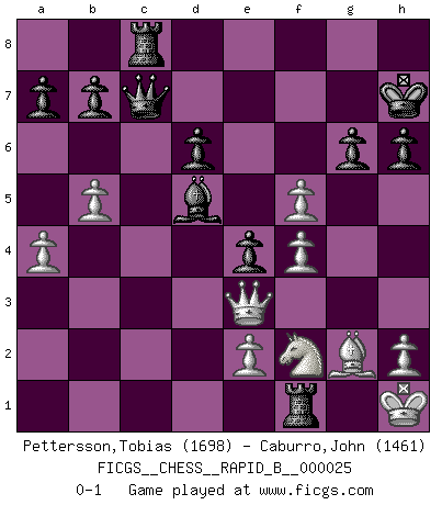 Last move : 0-1 2007 January 2 22:37:40 [Event "FICGS__CHESS__RAPID_B__000025"] [Site "FICGS"] [Date "2006.11.24"] [Round "1"] [White "Pettersson,Tobias"] [Black "Caburro,John"] [Result "0-1"] [WhiteElo "1698"] [BlackElo "1461"] 1.Nf3 f5 2.g3 Nf6 3.Bg2 g6 4.d4 Bg7 5.O-O O-O 6.c3 d6 7.a4 Qe8 8.Ng5 c6 9.b4 h6 10.Nh3 e5 11.Ba3 Nbd7 12.b5 c5 13.f4 e4 14.Nd2 Ng4 15.Qb3+ Kh7 16.Rfc1 cxd4 17.cxd4 Bxd4+ 18.Kh1 Bxa1 19.Rxa1 Nc5 20.Qc2 Be6 21.Nf1 Rc8 22.Bxc5 Rxc5 23.Qd2 Bd5 24.Ne3 Nxe3 25.Qxe3 Qf7 26.Nf2 Rfc8 27.g4 Qc7 28.Rf1 Rc1 29.gxf5 Rxf1+ 0-1 Reti v Dutch Kingside Castling by player White (move 5) Kingside Castling by player Black (move 5) Player Black won this chess game. Follow this game move after move (download)Fischer, who may or may not be mad as a hatter, has every right to be horrified. (Jeremy Silman) Ich war schon mal beim Dopingtest. Da musste ich Urin abgeben, während Dritte zusahen. (Elisabeth Pähtz) El juego de Fischer siempre fue nítido, racional y brillante. Uno de los mejores por siempre. (Dave Regis) On entre au jeu d'Echecs comme on entre en Religion. Pour le joueur d'Echecs, la partie d'Echecs c'est l'office, la messe, le défilé du 1er Mai, le dépôt de gerbe au Monument aux Morts. C'est un drame sacré. (Michel Roos) Computers are like Old Testament gods; lots of rules and no mercy. (Joseph Campbell)