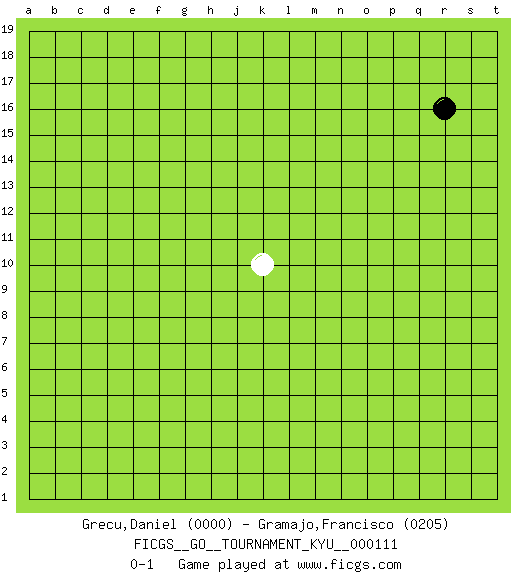 Last move : 0-1 2010 October 28 22:31:35 [Event "FICGS__GO__TOURNAMENT_KYU__000111"] [Site "FICGS"] [Date "2010.09.26"] [Round "1"] [Black "Grecu,Daniel"] [White "Gramajo,Francisco"] [Result "0-1"] [Rating 1 "0000"] [Rating 2 "0205"] 1.r16 k10 0-1 This go game has been lost on time (started : 2010.09.26 2:55:35) Here are the names of the openings (joseki) played in the four corners : Player White won this Go (weiqi, baduk) game. Follow this game move after move (download)Each step in a ladder is worth 7 points. (Anonymous) A good teacher is like a candle - it consumes itself to light the way for others. (Author unknown)