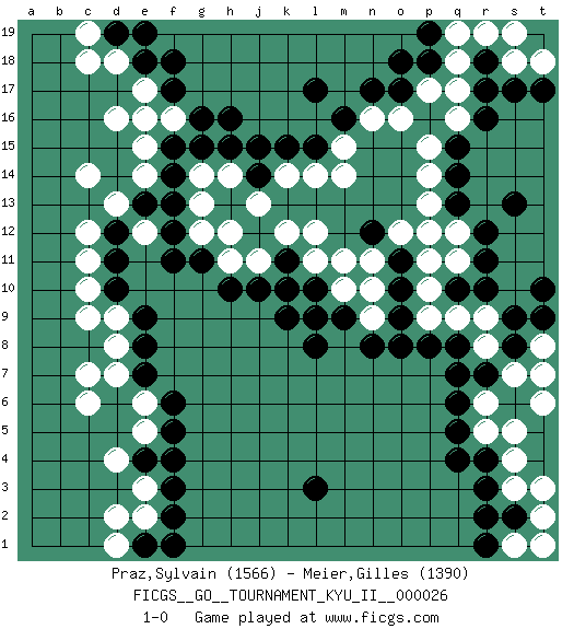 Last move : 1-0 2010 September 30 22:27:46 [Event "FICGS__GO__TOURNAMENT_KYU_II__000026"] [Site "FICGS"] [Date "2010.09.26"] [Round "1"] [Black "Praz,Sylvain"] [White "Meier,Gilles"] [Result "1-0"] [Rating 1 "1566"] [Rating 2 "1390"] 1.r16 d4 2.q4 d16 3.f17 c14 4.l17 r6 5.q10 r9 6.r10 s4 7.r3 c9 8.f3 e3 9.f4 c6 10.l3 d18 11.h16 p15 12.q14 p14 13.q13 p13 14.p12 q16 15.r17 q17 16.q15 q18 17.o17 o16 18.n17 n16 19.m16 m15 20.l15 m14 21.q8 r8 22.q6 r5 23.q5 q9 24.r7 s7 25.q7 p9 26.s6 s5 27.s8 t6 28.s9 s3 29.o9 p10 30.o10 p11 31.o11 q12 32.p8 q11 33.r12 o12 34.r11 p12 35.d10 c10 36.d11 c11 37.d12 c12 38.e7 d9 39.e9 l14 40.e8 c7 41.k15 n11 42.m9 d13 43.e18 e17 44.f18 f16 45.g16 e12 46.f11 k12 47.j10 k10 48.k9 j11 49.h10 l9 50.l10 m10 51.l8 n9 52.n8 n10 53.o8 l11 54.l9 h11 55.g11 g12 56.f2 e2 57.e1 d1 58.f1 d2 59.p18 p17 60.o18 s18 61.r18 r19 62.s17 t18 63.t17 s19 64.p19 q19 65.d19 c19 66.e19 c18 67.f15 e15 68.f14 e14 69.f12 g13 70.f13 h14 71.j14 j13 72.h15 k14 73.j15 g14 74.s2 t3 75.e13 e6 76.f6 e5 77.f5 d7 78.s13 t2 79.r2 s1 80.r1 d8 81.k11 t8 82.t10 k10 83.n12 m11 84.k11 l12 85.k10 e16 86.g15 h12 87.r4 t1 88.t9 t7 89.e4 1-0 Here are the names of the openings (joseki) played in the four corners : Corner d16 : d16 f17 Hoshi (Hwajeom, Seongjeom, Xingwei`) 4-4 Point. The star or hoshi (4-4) point, emphasizing influence at the potential expense of territory. Ikken Kakari (Hankan Keolch'im, Yi Gua`jiao~, 1-Space Low Approach). Black 2 is the standard approach move to the 4-4. Corner q4 : q4 r6 Hoshi (Hwajeom, Seongjeom, Xingwei`) 4-4 Point. The star or hoshi (4-4) point, emphasizing influence at the potential expense of territory. Ikken Kakari (Hankan Keolch'im, Yi Gua`jiao~, 1-Space Low Approach). White 2 is the standard approach move to the 4-4. Player Black won this Go (weiqi, baduk) game. Follow this game move after move (download)There is death in the hane. (Anonymous) Once you start thinking you have nothing left to learn, you have everything to learn. (Steve Badget)