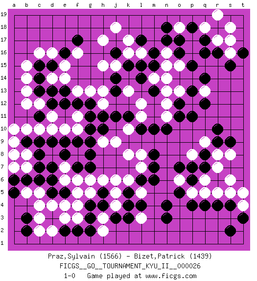 Last move : 1-0 2010 December 5 22:34:10 [Event "FICGS__GO__TOURNAMENT_KYU_II__000026"] [Site "FICGS"] [Date "2010.09.26"] [Round "1"] [Black "Praz,Sylvain"] [White "Bizet,Patrick"] [Result "1-0"] [Rating 1 "1566"] [Rating 2 "1439"] 1.r16 d16 2.q4 d4 3.f17 d14 4.l17 p17 5.q17 p16 6.q14 o15 7.m15 o13 8.q12 r8 9.r10 r5 10.r4 q5 11.p4 o6 12.n4 l3 13.j3 l5 14.n3 f3 15.m13 n12 16.o11 n11 17.n10 l11 18.m6 k6 19.m10 l12 20.q7 p8 21.q8 r7 22.r9 q6 23.p7 s5 24.s4 t4 25.t3 t5 26.s2 s6 27.h5 k8 28.l10 k10 29.k11 k13 30.j11 h13 31.h10 j9 32.g12 g13 33.f12 f13 34.g8 j4 35.h4 h3 36.k4 j5 37.k3 h6 38.g3 h2 39.g2 g5 40.g4 g6 41.l4 f10 42.f9 e10 43.g10 e7 44.e9 d10 45.d9 c10 46.c9 b10 47.c6 c4 48.b9 b5 49.e5 e6 50.d5 f4 51.f2 e4 52.b6 h12 53.h11 h9 54.g9 c5 55.d6 f5 56.d12 c12 57.e13 e14 58.c11 d11 59.c13 b12 60.d13 b13 61.c14 b14 62.c15 c16 63.d7 b7 64.a6 b8 65.e8 a9 66.a8 a7 67.c8 a8 68.c7 a10 69.f7 f6 70.g7 h17 71.e2 d2 72.b2 c2 73.b3 c3 74.a5 j18 75.d15 e15 76.e16 b15 77.e12 f16 78.n18 o18 79.n17 n16 80.m16 k16 81.o17 q18 82.o16 n15 83.p15 r17 84.q16 s18 85.p18 s16 86.s15 r19 87.t16 s17 88.k5 j6 89.l6 l7 90.m7 l8 91.m8 e3 92.p6 p5 93.o5 q9 94.o7 s8 95.s9 f11 96.g11 p12 97.p11 q13 98.o12 n13 99.p13 m14 100.l14 n14 101.k15 l16 102.l15 j15 103.j16 k17 104.j14 h15 105.j13 1-0 Here are the names of the openings (joseki) played in the four corners : Corner d16 : d16 f17 Hoshi (Hwajeom, Seongjeom, Xingwei`) 4-4 Point. The star or hoshi (4-4) point, emphasizing influence at the potential expense of territory. Ikken Kakari (Hankan Keolch'im, Yi Gua`jiao~, 1-Space Low Approach). Black 2 is the standard approach move to the 4-4. Corner q4 : q4 r8 Hoshi (Hwajeom, Seongjeom, Xingwei`) 4-4 Point. The star or hoshi (4-4) point, emphasizing influence at the potential expense of territory. Corner d4 : d4 j3 Hoshi (Hwajeom, Seongjeom, Xingwei`) 4-4 Point. The star or hoshi (4-4) point, emphasizing influence at the potential expense of territory. Player Black won this Go (weiqi, baduk) game. Follow this game move after move (download)Keep away from thickness. (Anonymous) Being number two sucks. (Andre Agassi)