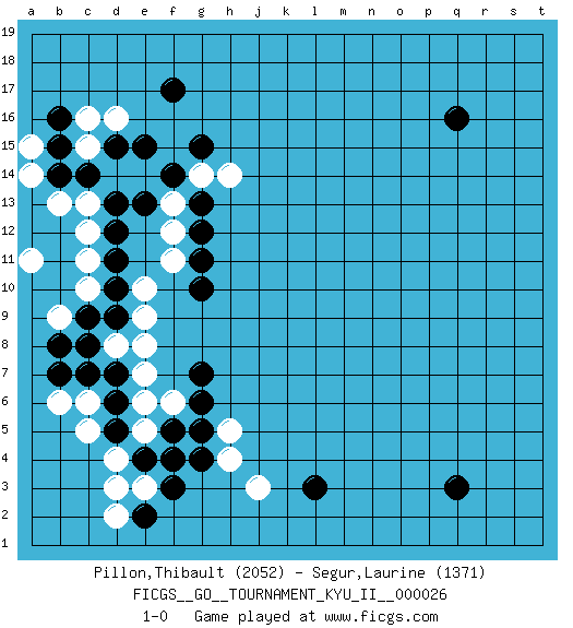 Last move : 1-0 2010 December 10 0:33:37 [Event "FICGS__GO__TOURNAMENT_KYU_II__000026"] [Site "FICGS"] [Date "2010.09.26"] [Round "1"] [Black "Pillon,Thibault"] [White "Segur,Laurine"] [Result "1-0"] [Rating 1 "2052"] [Rating 2 "1371"] 1.q16 d4 2.q3 d16 3.f3 j3 4.f5 f4 5.e4 e5 6.g4 e3 7.f4 d2 8.e2 d3 9.d5 e6 10.d6 e7 11.d7 e8 12.c9 c5 13.b7 d8 14.c8 c6 15.c7 b6 16.c14 c11 17.d11 c10 18.d9 e10 19.d10 c12 20.d12 c13 21.d13 d14 22.b14 b13 23.d15 e14 24.e15 c15 25.f14 a14 26.b15 c16 27.e13 a15 28.b16 b9 29.b8 a11 30.l3 h4 31.g7 f6 32.g6 h5 33.g5 e9 34.g10 f11 35.g11 f12 36.g12 f13 37.g13 g14 38.g15 h14 39.f17 1-0 Here are the names of the openings (joseki) played in the four corners : Corner d4 : d4 f3 Hoshi (Hwajeom, Seongjeom, Xingwei`) 4-4 Point. The star or hoshi (4-4) point, emphasizing influence at the potential expense of territory. Ikken Kakari (Hankan Keolch'im, Yi Gua`jiao~, 1-Space Low Approach). Black 2 is the standard approach move to the 4-4. Corner d16 : d16 c14 Hoshi (Hwajeom, Seongjeom, Xingwei`) 4-4 Point. The star or hoshi (4-4) point, emphasizing influence at the potential expense of territory. Ikken Kakari (Hankan Keolch'im, Yi Gua`jiao~, 1-Space Low Approach). Black 2 is the standard approach move to the 4-4. Player Black won this Go (weiqi, baduk) game. Follow this game move after move (download)Keshi is worth as much as an invasion ! (Anonymous) Drag your thoughts away from your troubles... by the ears, by the heels, or any other way you can manage it. (Mark Twain)