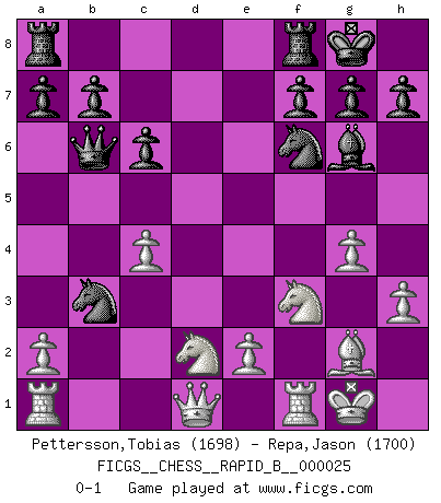 Last move : 0-1 2006 December 27 11:31:59 [Event "FICGS__CHESS__RAPID_B__000025"] [Site "FICGS"] [Date "2006.11.24"] [Round "1"] [White "Pettersson,Tobias"] [Black "Repa,Jason"] [Result "0-1"] [WhiteElo "1698"] [BlackElo "1700"] 1.Nf3 d5 2.g3 Nf6 3.Bg2 c6 4.O-O Bg4 5.d3 Nbd7 6.h3 Bh5 7.Bf4 e6 8.Nh2 Qb6 9.b3 e5 10.Be3 Bc5 11.Bxc5 Nxc5 12.Nd2 O-O 13.c4 e4 14.dxe4 dxe4 15.g4 Bg6 16.f4 exf3 17.Nhxf3 Nxb3 0-1 Reti : King's Indian attack, Yugoslav variation Kingside Castling by player White (move 4) Kingside Castling by player Black (move 12) Player Black won this chess game. Follow this game move after move (download)When you are lonely, when you feel yourself an alien in the world, play Chess. This will raise your spirits and be your counselor in war. (Aristotle) Was ist der Unterschied zwischen einem Strassenarbeiter und einem Schachspieler? --Der Schachspieler bewegt sich ab und zu. (Anonymous) El Ajedrez por encima de todo... ¡es una pelea!. (Emanuel Lasker) Je ne suis pas le dernier à jouer lâchement des coups douteux pendant le zeïtnot de l'adversaire pour l'achever: en effet les coups qui font le plus peur sont ceux que l'on ne comprend pas. Je me fais souvent peur quand je joue. (Un professeur anonyme) A shortcut is the longest distance between two points. (Don Groves)
