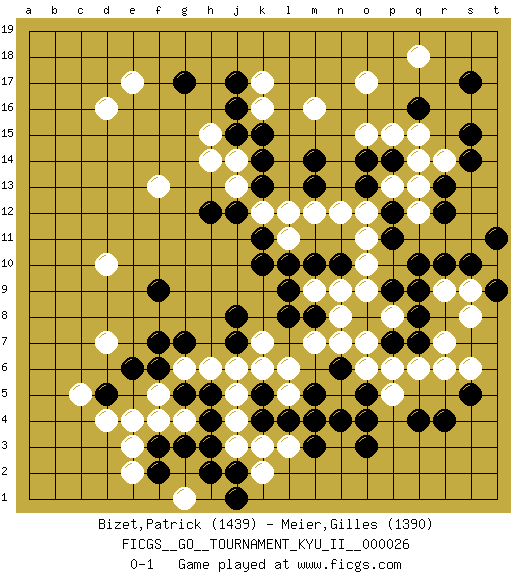 Last move : 0-1 2010 November 6 18:58:27 [Event "FICGS__GO__TOURNAMENT_KYU_II__000026"] [Site "FICGS"] [Date "2010.09.26"] [Round "1"] [Black "Bizet,Patrick"] [White "Meier,Gilles"] [Result "0-1"] [Rating 1 "1439"] [Rating 2 "1390"] 1.q4 d16 2.q16 d4 3.k4 k16 4.q10 d10 5.k10 o17 6.p14 q18 7.m14 m16 8.k13 h14 9.h12 f13 10.j7 d7 11.g3 r6 12.r4 r9 13.r10 s9 14.s10 p6 15.q7 q6 16.p7 o7 17.q9 r7 18.s5 s6 19.t9 s8 20.o3 o9 21.o5 o6 22.m8 m7 23.m5 p8 24.q8 n8 25.p9 m9 26.l8 o11 27.n10 n9 28.l9 o10 29.m10 q12 30.r12 q13 31.r13 q14 32.s15 r14 33.s14 p15 34.o14 q15 35.p11 n12 36.p12 p13 37.o13 o12 38.k14 p5 39.o4 l6 40.k5 l5 41.l4 m4 42.n6 n7 43.s17 t10 44.t11 l11 45.l10 k12 46.j12 j13 47.j15 h15 48.j16 o15 49.m13 m12 50.k11 l12 51.j17 k17 52.g17 j14 53.k15 k7 54.j8 j6 55.g7 k6 56.f9 g6 57.f6 f5 58.g5 h6 59.f7 g4 60.h5 j5 61.h4 j4 62.h3 j3 63.m3 l3 64.n4 k3 65.m4 f4 66.f3 e3 67.d5 c5 68.e6 e4 69.f2 e2 70.j2 k2 71.j1 e17 72.h2 g1 0-1 Here are the names of the openings (joseki) played in the four corners : Corner q16 : q16 o17 Hoshi (Hwajeom, Seongjeom, Xingwei`) 4-4 Point. The star or hoshi (4-4) point, emphasizing influence at the potential expense of territory. Ikken Kakari (Hankan Keolch'im, Yi Gua`jiao~, 1-Space Low Approach). White 2 is the standard approach move to the 4-4. Corner d4 : d4 j7 Hoshi (Hwajeom, Seongjeom, Xingwei`) 4-4 Point. The star or hoshi (4-4) point, emphasizing influence at the potential expense of territory. Corner q4 : q4 r6 Hoshi (Hwajeom, Seongjeom, Xingwei`) 4-4 Point. The star or hoshi (4-4) point, emphasizing influence at the potential expense of territory. Ikken Kakari (Hankan Keolch'im, Yi Gua`jiao~, 1-Space Low Approach). White 2 is the standard approach move to the 4-4. Player White won this Go (weiqi, baduk) game. Follow this game move after move (download)Go is to western chess what philosophy is to double entry accounting. (from Shibumi, by Trevanian) All maxims have their antagonist maxims; proverbs should be sold in pairs, a single one being but a half truth. (William Mathews)