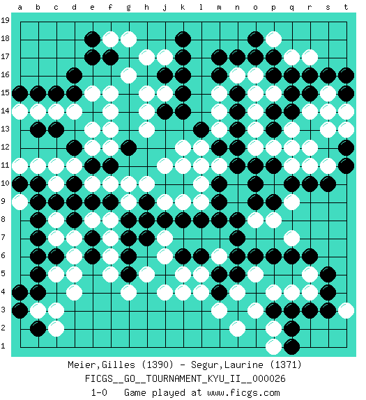 Last move : 1-0 2011 January 29 19:22:50 [Event "FICGS__GO__TOURNAMENT_KYU_II__000026"] [Site "FICGS"] [Date "2010.09.26"] [Round "1"] [Black "Meier,Gilles"] [White "Segur,Laurine"] [Result "1-0"] [Rating 1 "1390"] [Rating 2 "1371"] 1.q16 d4 2.d16 q4 3.k16 k4 4.c6 d9 5.e6 g4 6.b4 c3 7.b9 c8 8.b8 c7 9.b7 n4 10.r10 f8 11.c15 h17 12.f17 j17 13.k17 g16 14.r6 c11 15.r15 n16 16.o17 f15 17.k14 m15 18.n17 m13 19.p13 m11 20.p6 k12 21.r3 r4 22.q3 p4 23.p3 o3 24.s4 c5 25.b5 d6 26.b6 b3 27.d10 c10 28.c9 f13 29.d8 d7 30.e9 e8 31.d9 f10 32.f9 g9 33.e7 d5 34.g8 f7 35.g7 f6 36.g6 f5 37.h9 g10 38.k8 j9 39.j8 h10 40.m8 l9 41.l8 d11 42.b10 b11 43.a4 a9 44.a10 n9 45.n7 m6 46.n6 j6 47.e11 e12 48.f11 e10 49.g12 h13 50.j10 h8 51.h7 j11 52.k10 k9 53.m9 l10 54.m10 n10 55.h9 k11 56.m17 q9 57.n11 o12 58.o11 p10 59.p11 q11 60.q10 p12 61.q12 r11 62.n12 o13 63.p9 p8 64.o9 o8 65.o10 q13 66.p14 r12 67.n13 o14 68.n14 o15 69.n15 o16 70.m16 p15 71.q14 r14 72.q15 s14 73.s10 s13 74.t12 s15 75.s16 s11 76.t11 t13 77.t15 t14 78.t16 r17 79.r16 q17 80.p16 q12 81.p17 p18 82.o18 m14 83.m12 l12 84.n8 l11 85.m5 l5 86.m4 m3 87.n5 o5 88.o6 l4 89.l6 t3 90.s3 j7 91.h8 d14 92.c13 c14 93.b13 a11 94.d12 f12 95.e14 b14 96.b15 a14 97.a15 e15 98.d15 f14 99.l13 j15 100.k15 f18 101.e18 g18 102.j14 h14 103.j16 h15 104.e17 r5 105.s5 q7 106.q6 p2 107.q2 p1 108.q1 n2 109.j5 h5 110.a3 e13 111.b2 c2 112.g5 j4 113.k6 k5 114.k18 1-0 Here are the names of the openings (joseki) played in the four corners : Corner d4 : d4 c6 Hoshi (Hwajeom, Seongjeom, Xingwei`) 4-4 Point. The star or hoshi (4-4) point, emphasizing influence at the potential expense of territory. Ikken Kakari (Hankan Keolch'im, Yi Gua`jiao~, 1-Space Low Approach). Black 2 is the standard approach move to the 4-4. Player Black won this Go (weiqi, baduk) game. Follow this game move after move (download)Only amateurs try to come up with fancy moves. (Anonymous) For to win one hundred victories in one hundred battles is not the acme of skill. To subdue the enemy without fighting is the acme of skill. (Sun Tzu)