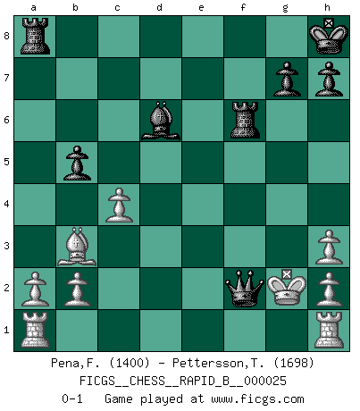 Last move : 0-1 2006 December 13 18:28:12 [Event "FICGS__CHESS__RAPID_B__000025"] [Site "FICGS"] [Date "2006.11.24"] [Round "1"] [White "Pena,Francisco"] [Black "Pettersson,Tobias"] [Result "0-1"] [WhiteElo "1400"] [BlackElo "1698"] 1.e4 c5 2.Nf3 Nc6 3.Bc4 d6 4.Nc3 a6 5.Ng5 e6 6.d3 Be7 7.Qg4 Nf6 8.Qg3 Nd4 9.Kd1 O-O 10.Ne2 Nxe2 11.Kxe2 d5 12.e5 Ne8 13.Bb3 b5 14.c4 f6 15.exf6 Rxf6 16.Bc2 d4 17.Ne4 Rg6 18.Qh3 e5 19.cxb5 Bxh3 20.Bb3 Kh8 21.gxh3 axb5 22.f4 c4 23.dxc4 d3+ 24.Kf3 d2 25.Bxd2 Qd3+ 26.Be3 exf4 27.Kxf4 Nf6 28.Nxf6 Rxf6+ 29.Kg4 Qe4+ 30.Kg3 Bd6+ 31.Bf4 Qxf4+ 32.Kg2 Qf2+ 0-1 Sicilian defense Kingside Castling by player Black (move 9) Player Black won this chess game. Follow this game move after move (download)Chess is ruthless: you've got to be prepared to kill people. (Nigel Short) Nicht daß Diemer aus Opportunismus Mitglied der NSDAP geworden wäre. Er war ein Fanatiker, in allem, was er tat. (Hans Ree) Un Peón pasado aumenta su poder a medida de que el número de piezas en el tablero disminuye. (Capablanca) Le succès, c'est être capable d'aller d'échec en échec sans perdre son enthousiasme. (Winston Churchill) Don't be discouraged. It's often the last key in the bunch that opens the lock. (Author unknown)