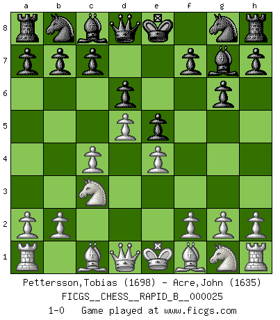 Last move : 1-0 2006 December 29 14:51:23 [Event "FICGS__CHESS__RAPID_B__000025"] [Site "FICGS"] [Date "2006.11.24"] [Round "1"] [White "Pettersson,Tobias"] [Black "Acre,John"] [Result "1-0"] [WhiteElo "1698"] [BlackElo "1635"] 1.e4 g6 2.d4 Bg7 3.c4 d6 4.Nc3 e5 5.d5 1-0 This chess game has been lost on time (started : 2006.11.24 16:0:33) Robatsch (Modern) defense Player White won this chess game. Follow this game move after move (download)We like to think. (Gary Kasparov) Schach ist das schnellste Spiel der Welt, weil man in jeder Sekunde Tausende von Gedanken ordnen muß. (Albert Einstein) El Ajedrez es tortura mental. (Garry Kasparov) Si le désir cupide (et stupide) de gagner est une inépuisable source de souffrance, une combinaison brillante sur l'échiquier est une découverte : le coquelicot qui s'épanouit lorsque apparaît la Voie Lactée. (Arrabal) Once you start thinking you have nothing left to learn, you have everything to learn. (Steve Badget)